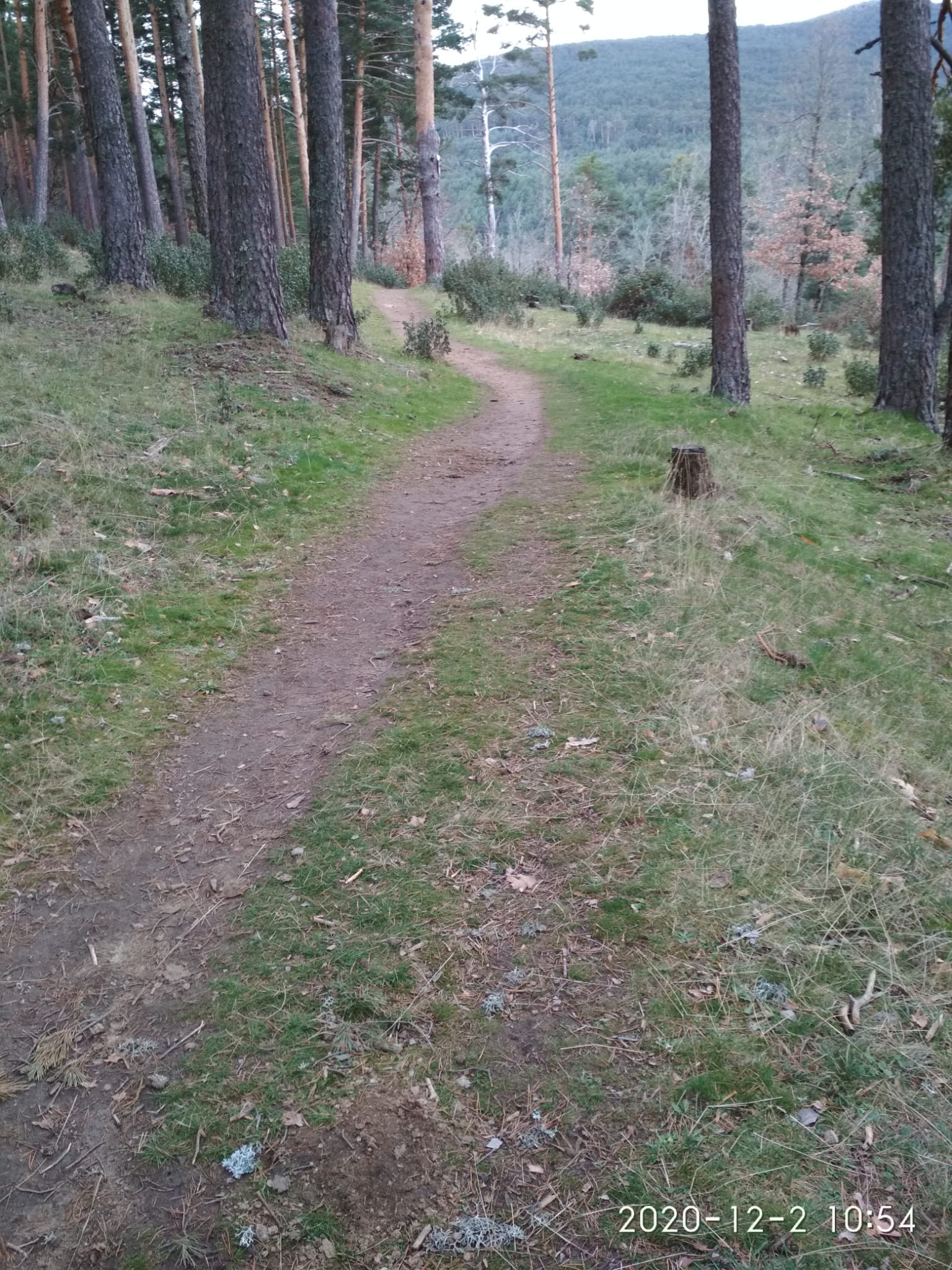 Ya en la cola del Pantano, se nos presentan dos alternativas en el camino. Sin casi detenernos, vemos unos indicadores que nos señalan una pequeña ascensión hacia la izquierda cuya inclinación poco a poco se va haciendo más fuerte y que nos dirige hacia una vereda que atraviesa una carretera asfaltada que cruzamos hasta encontrar un indicador de flechas de madera que nos desvía hacia la derecha.