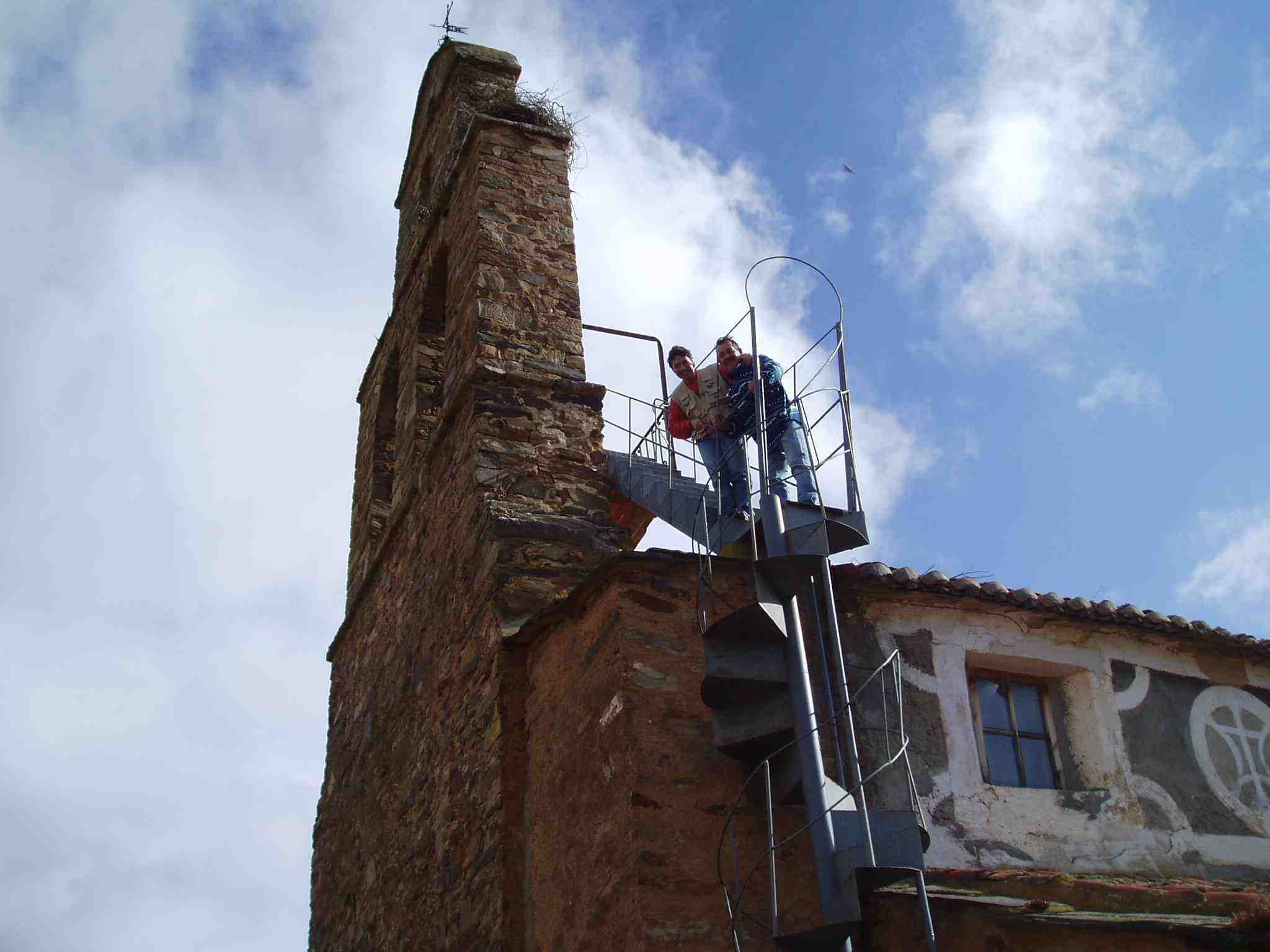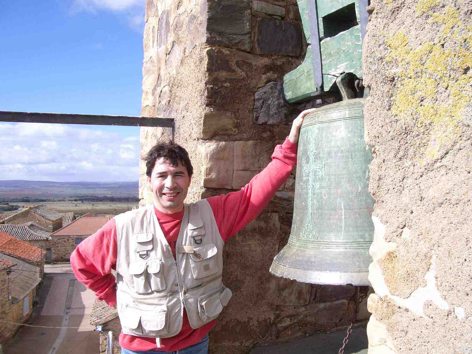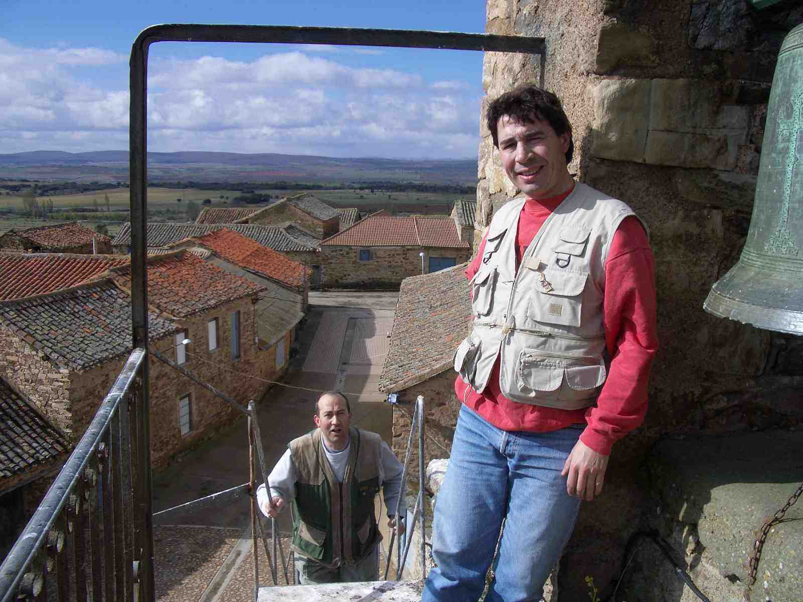 Ya en Santa Catalina, tropiezan con una escalera de caracol y de hierro que por el exterior de la iglesia sube hasta el campanario. Sin dudarlo, dejando las mochilas en el suelo, suben con intención de fotografiarse en lo alto junto a las campanas.