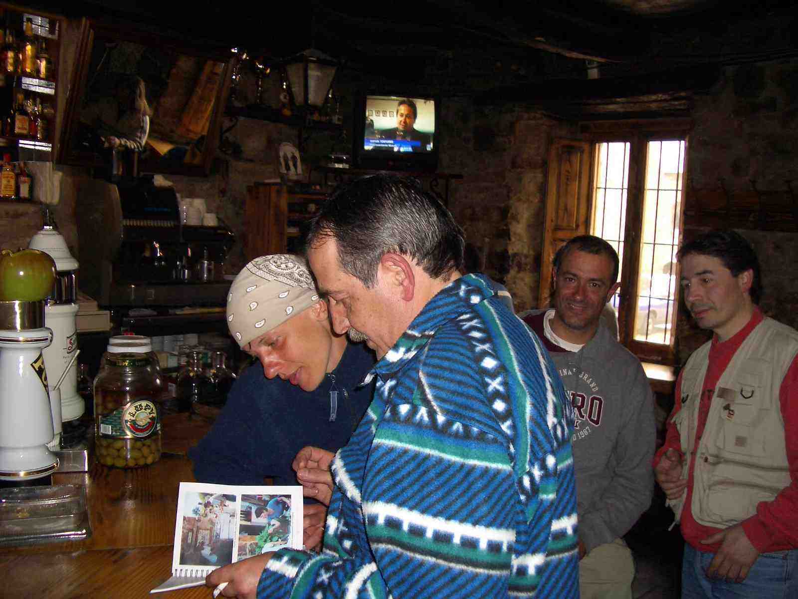 Mientras esperan la comida, llegan al mesón de nuevo Ute y Alfonso, con quienes toman unas nuevas cervezas mientras charlan con Ute sobre la pronunciación de la frase en alemán que Primi había aprendido en el “Camino” del año anterior (“Du Bist Sehr Schön”, que debe significar algo como “qué preciosa eres”) y les enseñan las fotos del libro que llevaban como regalo para Carmen, de Ribadiso.