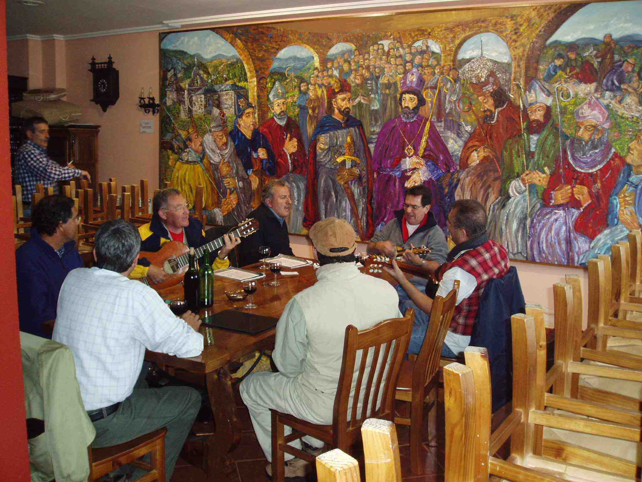 Aunque el salón es grande, sólo hay tres mesas ocupadas. Además de la suya, otra por un grupo de peregrinos valencianos jubilados de Bancaja y otra por dos peregrinas desconocidas. Primi y Ángel aseguran a Michel que Ute ha subido por fin hasta allí y se encuentra en el otro albergue, cosa que Michel no acaba de creerse. Mientras intentan convencerle de que es cierto, llega un grupo de músicos que, decididos, se sientan en una de las mesas vacías y comienzan a cantar preciosas isas canarias. Después sabrían, por explicaciones de Chencho, que eran un grupo de peregrinos del Puerto de la Cruz, de Tenerife, y que iban haciendo el “Camino” con un coche de apoyo. Aquella noche volverían a dormir a Rabanal para continuar el camino a la mañana siguiente desde el punto donde lo habían dejado. A partir de ahora les llamarían “Los Sabandeños”.