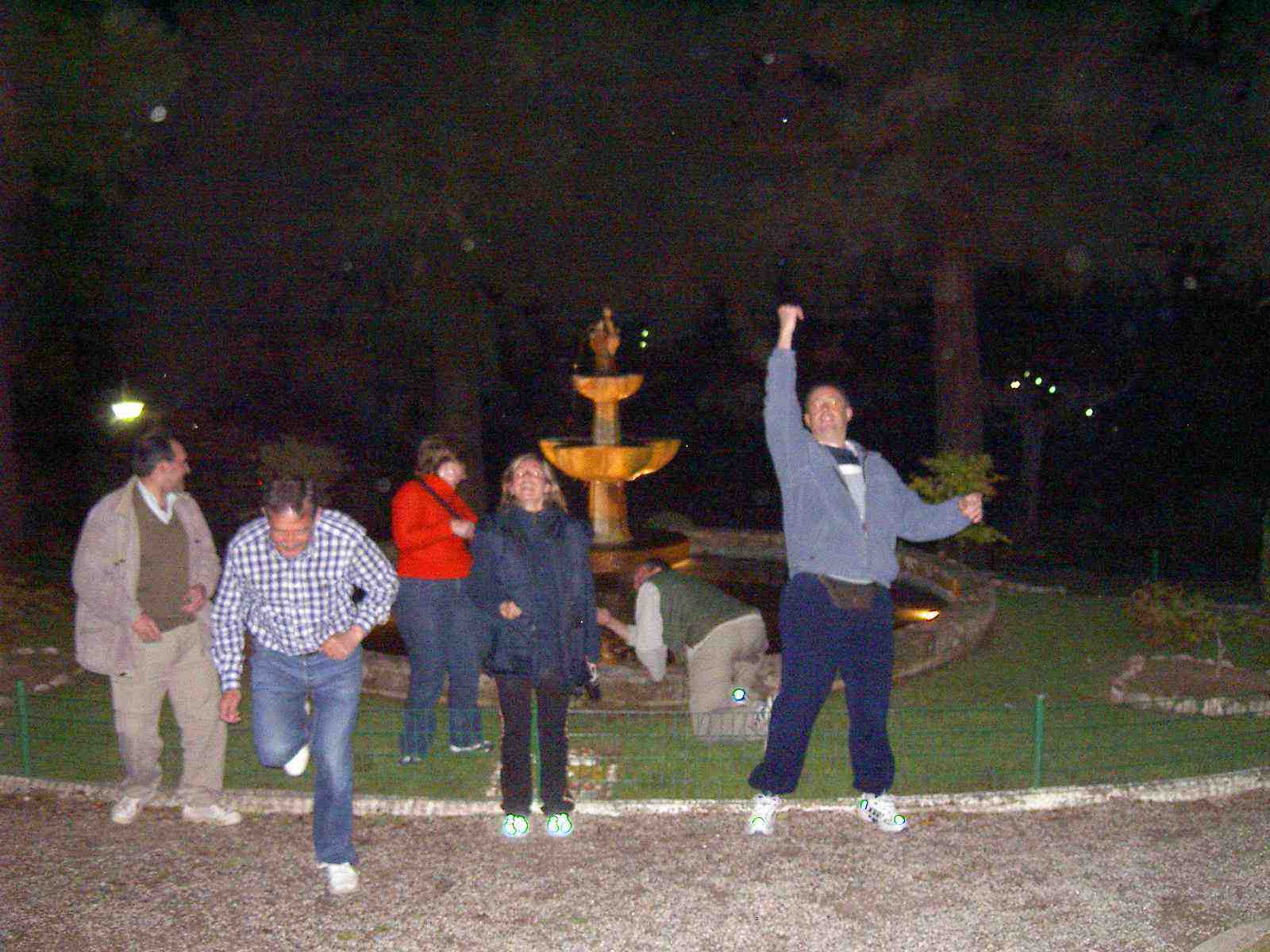 La cena en "el Alemán" fue muy agradable. Luís el Negro les mostraba sonriente su guante de pescar, y les explicaba la extraña técnica que utilizaba, sacando un dedo fuera por uno de los dedos del guante agujereado. Cuando le preguntaron cuándo iba a sacar la caña, con el tema de “te la voy a sacar" y "te la voy a enseñar” se rieron un montón. Después de un par de excelentes “elixires” salieron con intención de dar una vuelta por el pueblo. Hacía una buena noche y apetecía pasear. Cerca de una bonita fuente iluminada Ángel propuso a todos pedir un deseo.