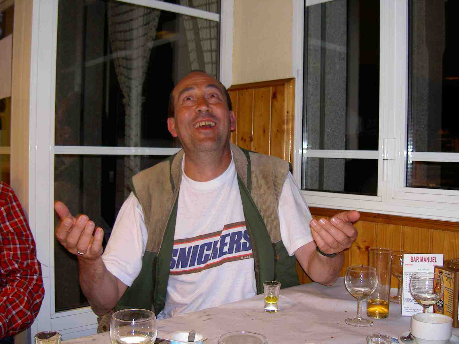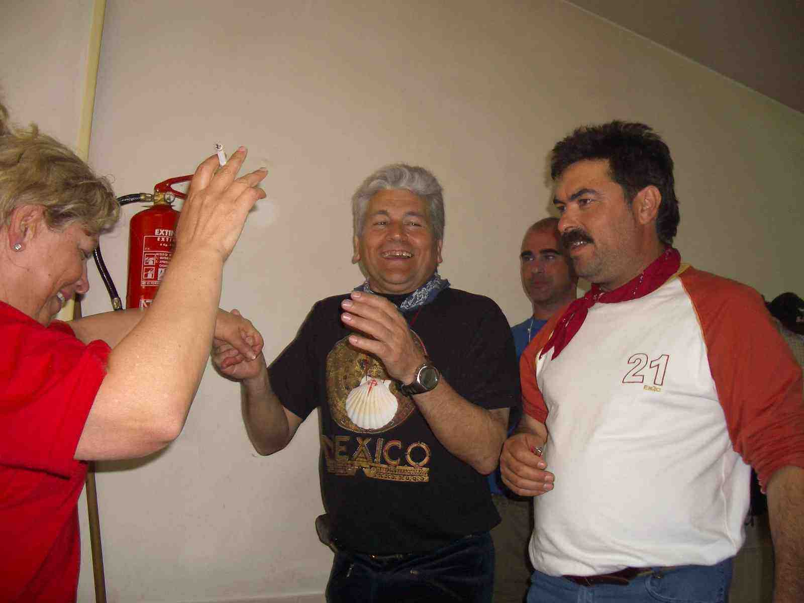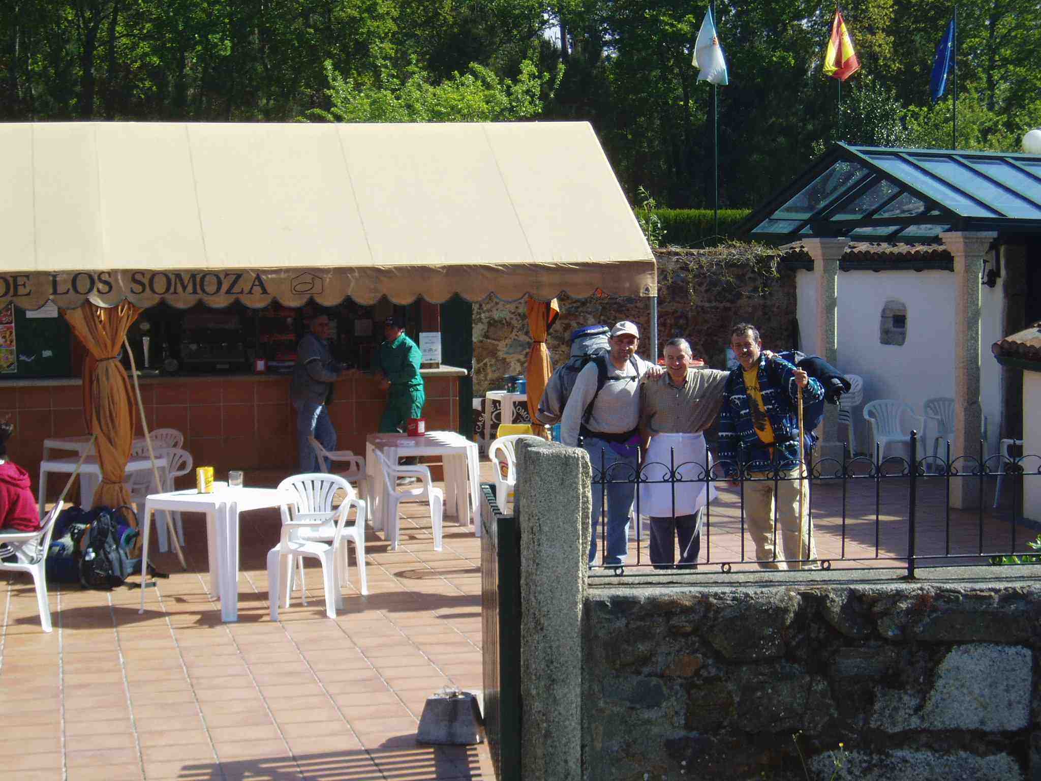 "camello" de Ángel. Carmen, muy amable, les ha sorprendido regalándoles nueve camisetas de su Bar. Ellos prometen, y así lo harían, entrar en Santiago con ellas puestas. Después de un par de "elixires del Santo", algunos peregrinos se han ido retirando hacia el albergue. Ángel y Luís Martín también se van acompañados por Reyes y las Beni's.