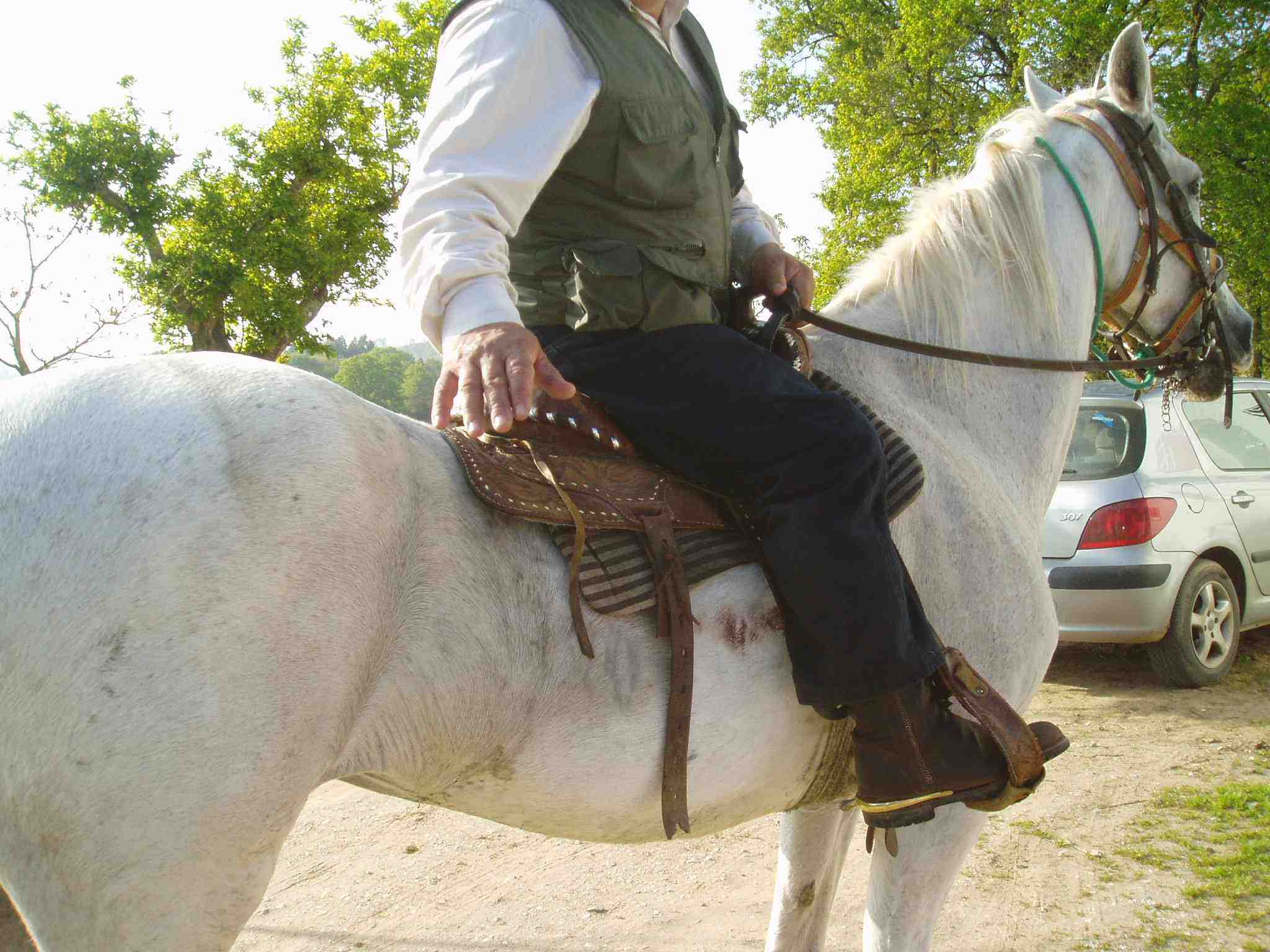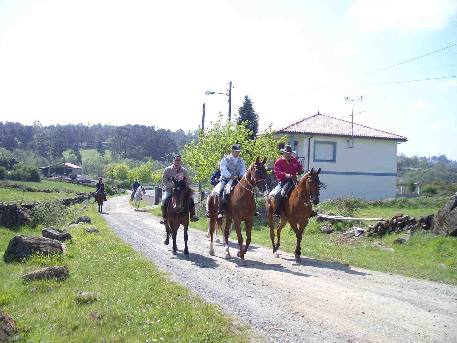 Mientras disfrutaban del sol charlando animadamente, ha llegado el grupo de peregrinos caballistas que se dirigen hasta Arzúa. Traían a lomos de los caballos a las dos mujeres de Marbella y a Yolanda, de Madrid. El responsable del grupo de jinetes les ha entregado una tarjeta por si, en alguna ocasión, les diera por hacer el Camino a caballo. Siemplemente es un tema económico.