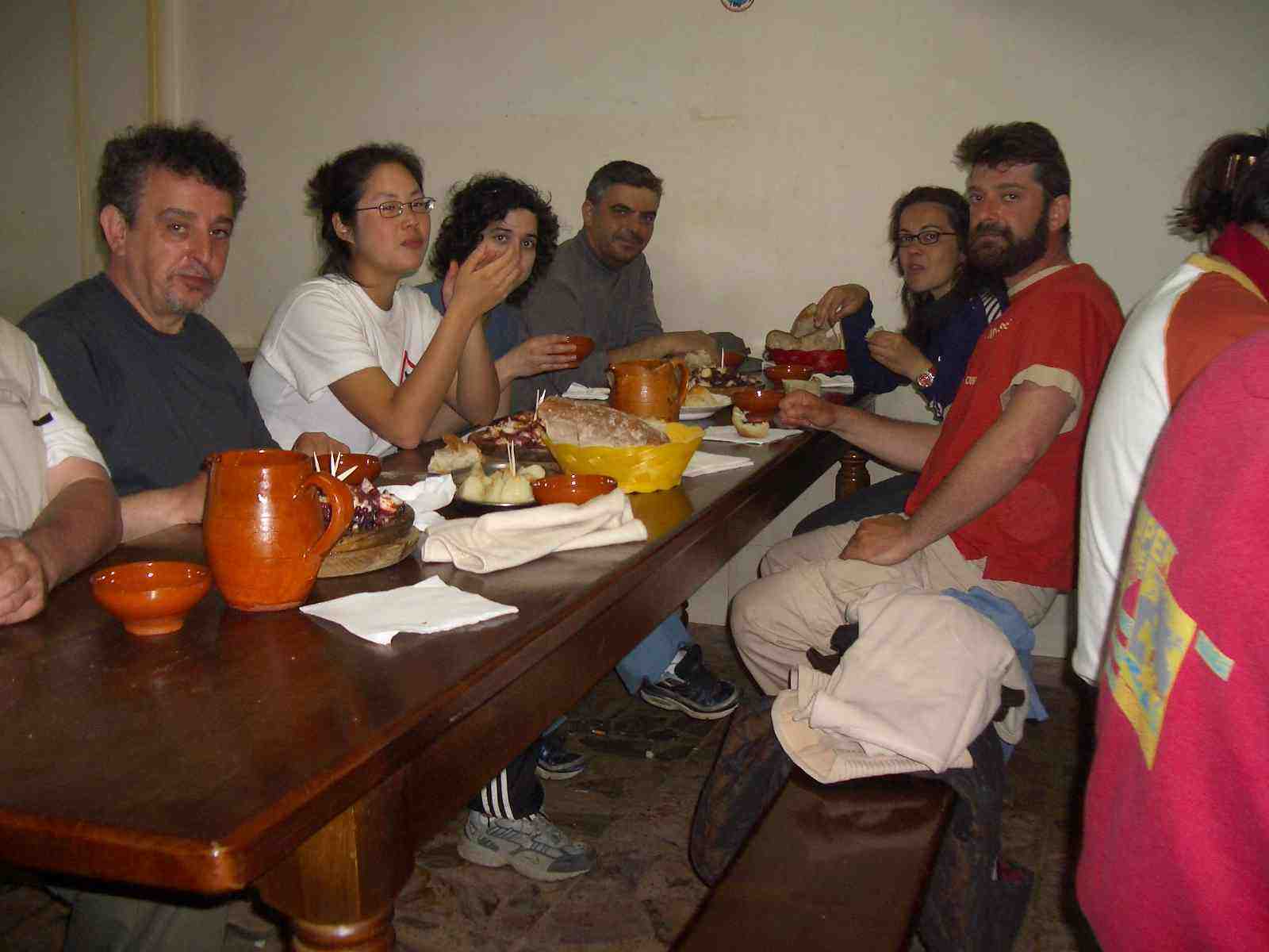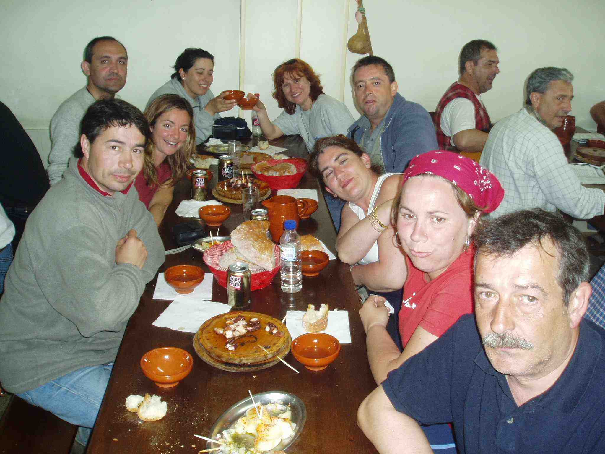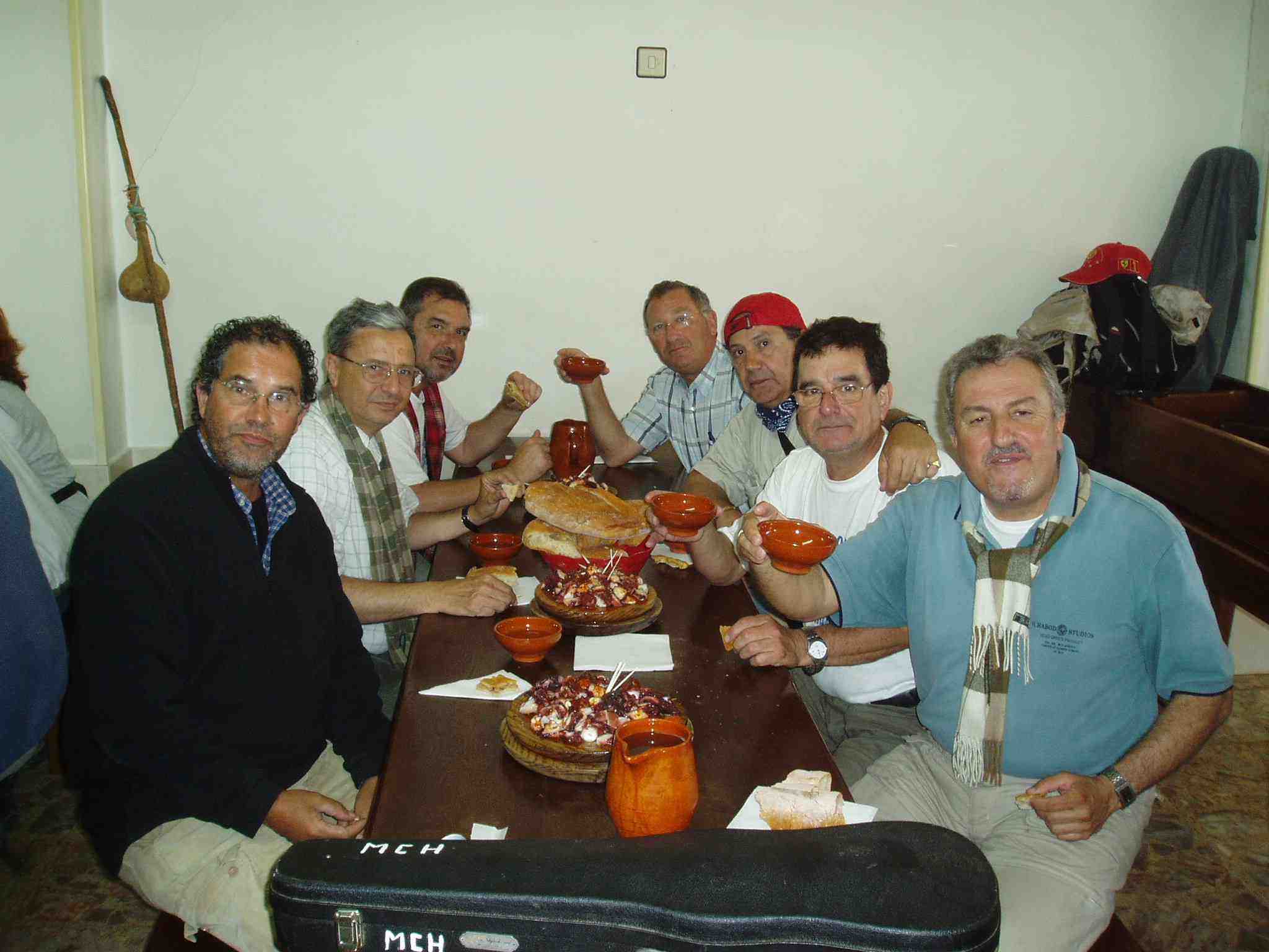 Poco a poco se fueron llenando las mesas de peregrinos dispuestos a dar buena cuenta del pulpo, las patatas y el fresco ribeiro que, tomado en taza, hacía las delicias de los agotados caminantes.
