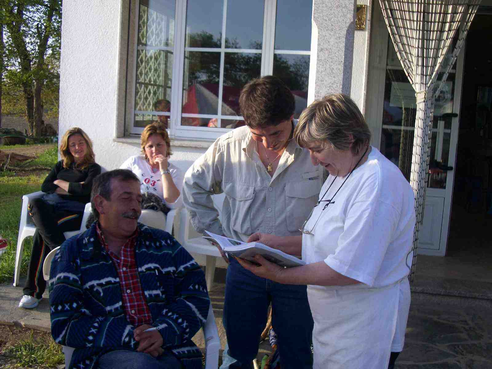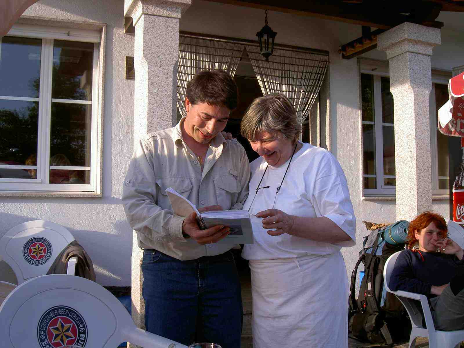 Después de hacer entrega oficial a Carmen del libro de recuerdos del Camino del año anterior que han llevado para ella durante todo el viaje y que tantas veces lo han mostrado a diferentes peregrinos, han entrado dentro con intención de cenar.