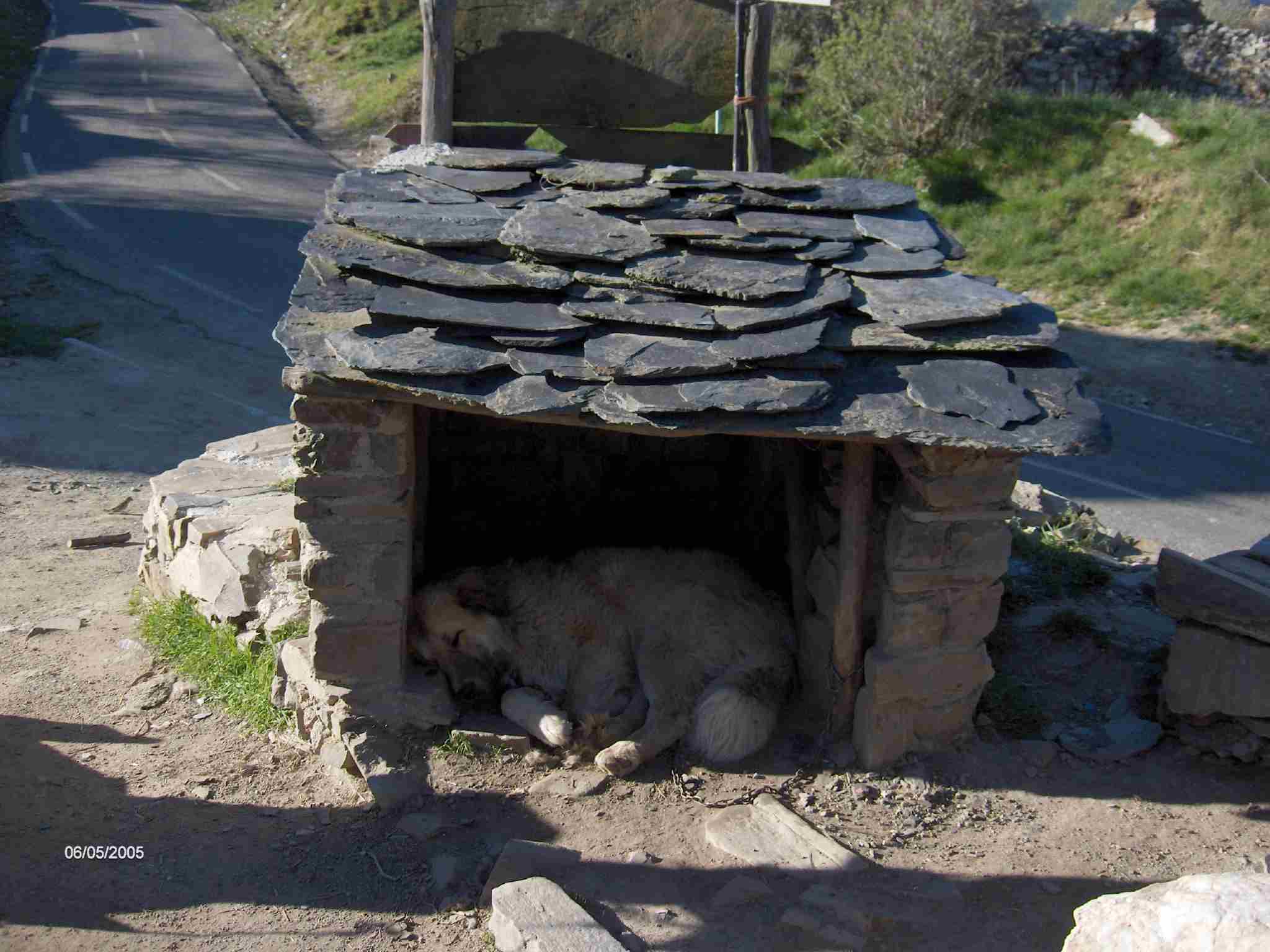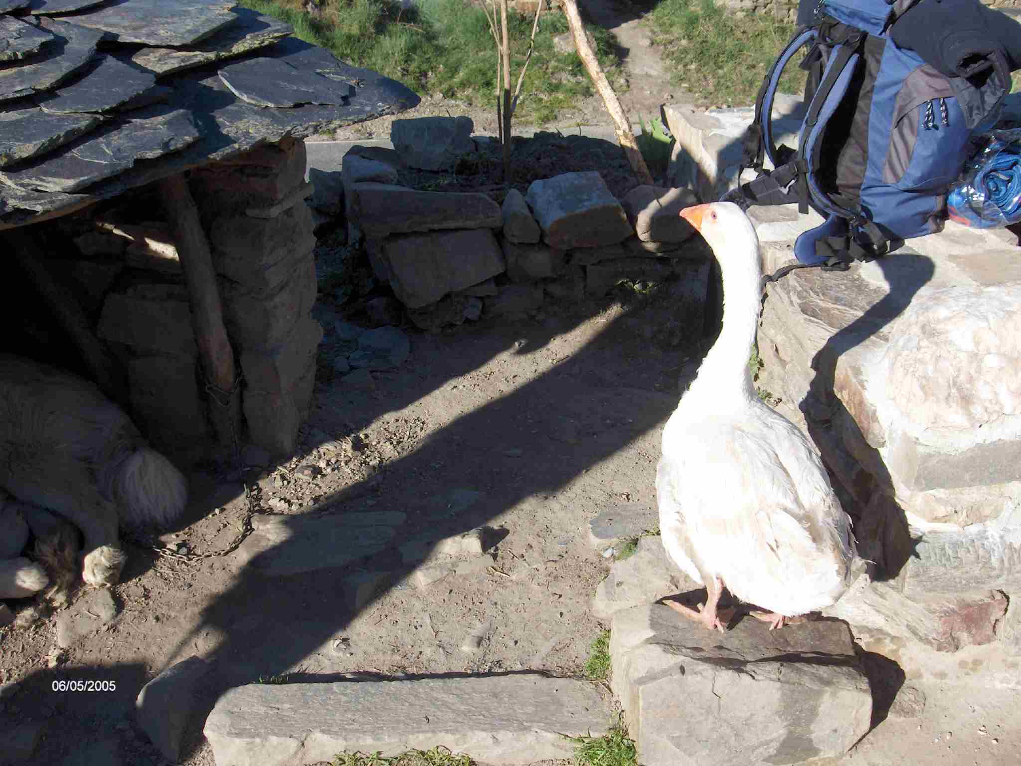 Algunos peregrinos pasan por el Camino sin detenerse. Marina, la muchacha lavandera, nos saluda desde lejos a su paso. Un bonito perro descansa adormecido en su caseta hecha de piedra sin preocuparse lo más mínimo por lo que sucede a su alrededor. Una agresiva oca arremete con el pico preparado contra cualquier persona que se mueve. Temerosos, tenemos mucho cuidado con ella porque si te engancha te hace daño.