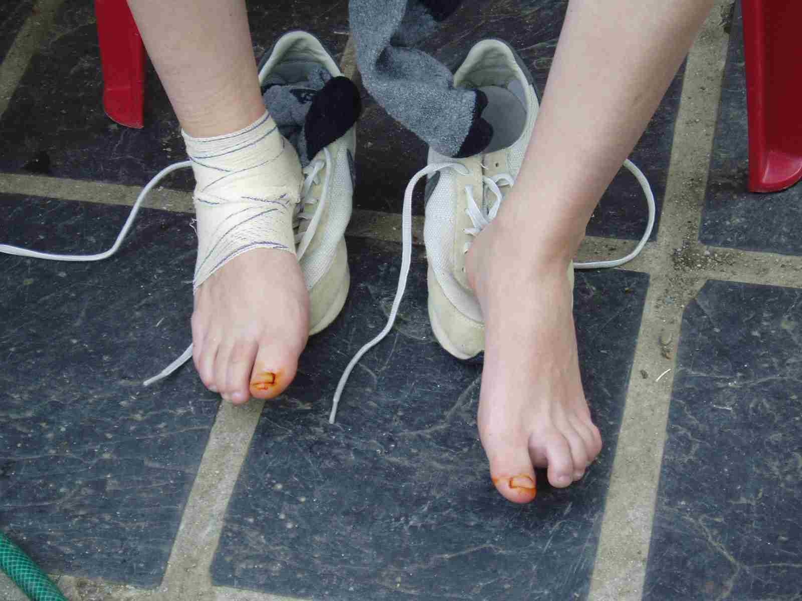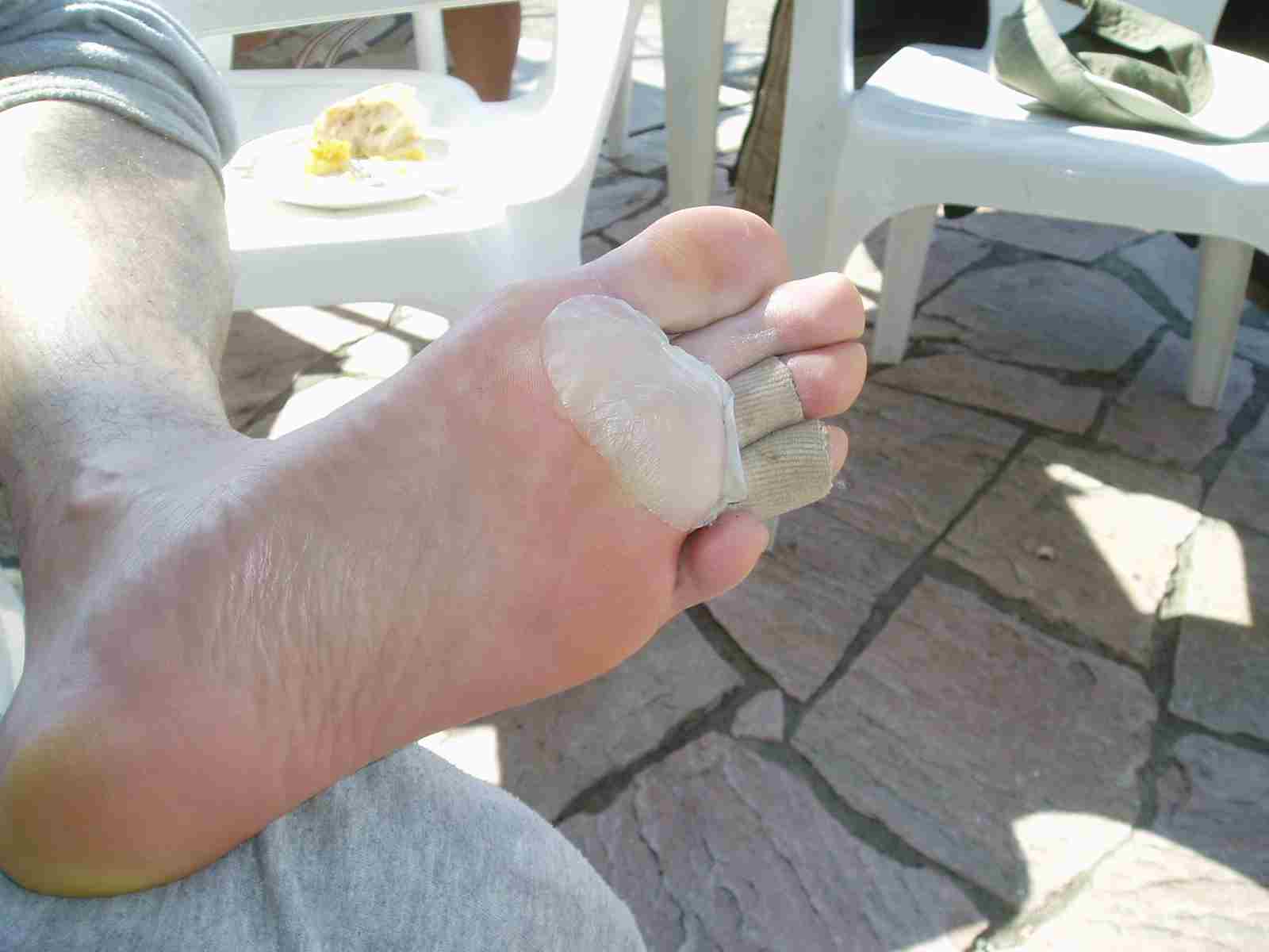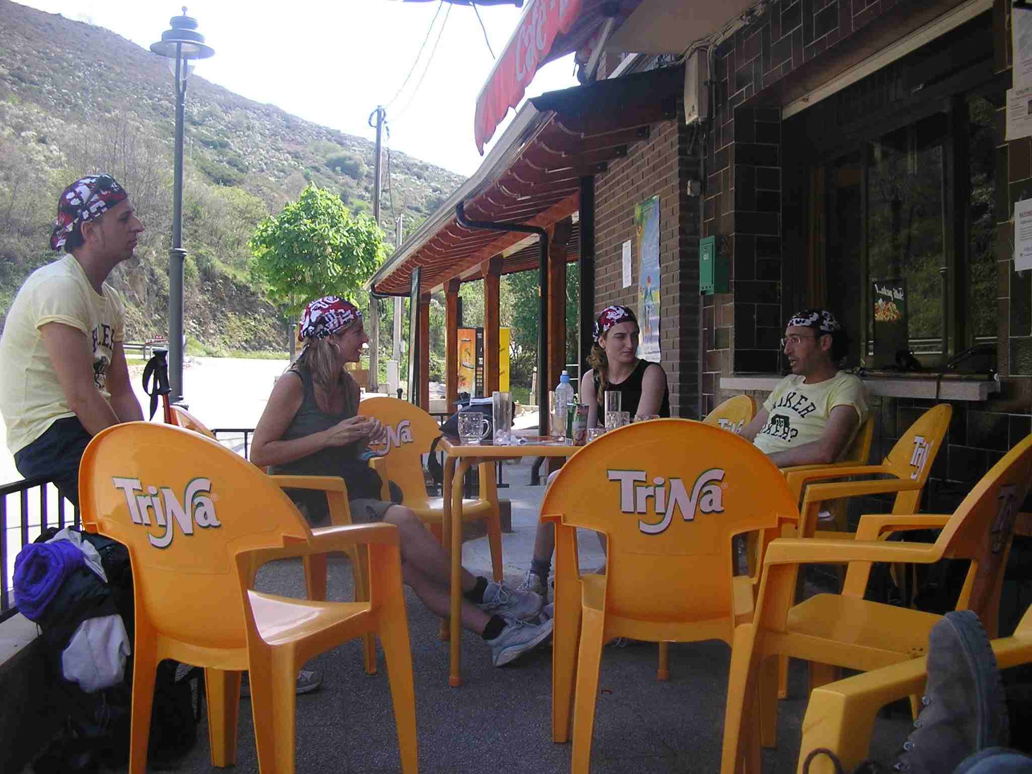 En la terraza de La Fragua de Marta, después de saludar a su familia y mientras esperamos tomando unas cervezas a Luis, con sus truchas, y la preparación de la comida, efectuamos algunas I.T.V., ahora ya muy necesarias. Las uñas de los pies de Paloma que amenazan con saltar de un momento a otro requieren suma atención. Otros cuídan de sus ampollas con esmero. Mientras tanto, Michel y Ángel, muy divertidos, enredan con una manguera de agua, no sin antes avisar a Dalia para que proteja nuestro libro, que está leyendo muy interesada.