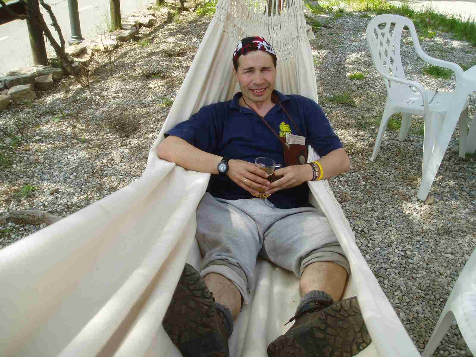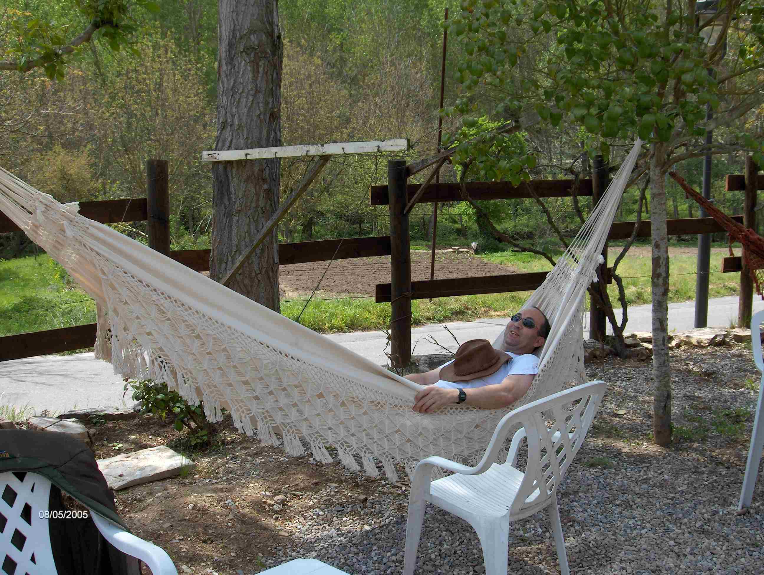 Después de saludar a Bibiana que tenía intención de pernoctar allí y revisar Michel nuestra página en un ordenador del restaurante, salimos con intención de continuar el Camino, no sin antes hacernos unas fotos en varias hamacas, comodísimas, que encontramos en la puerta del albergue.