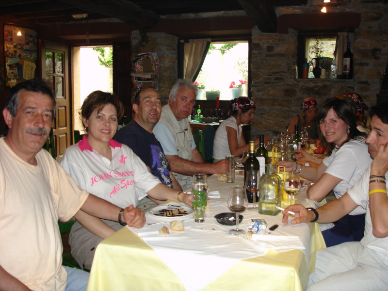 Después de algunos "elixires del Santo" en la sobremesa, la gente comienza a prepararse para la dura ascensión del Cebreiro. Una vez despedidos de la familia de Marta y de Bebi y Dalia, Michel y yo, acompañados por Ángel, que nos esperaba sonriente temiendo que nos subiéramos el monte por carretera en el Audi de Bebi, hemos comenzado la dura ascensión rezagados del resto del grupo.