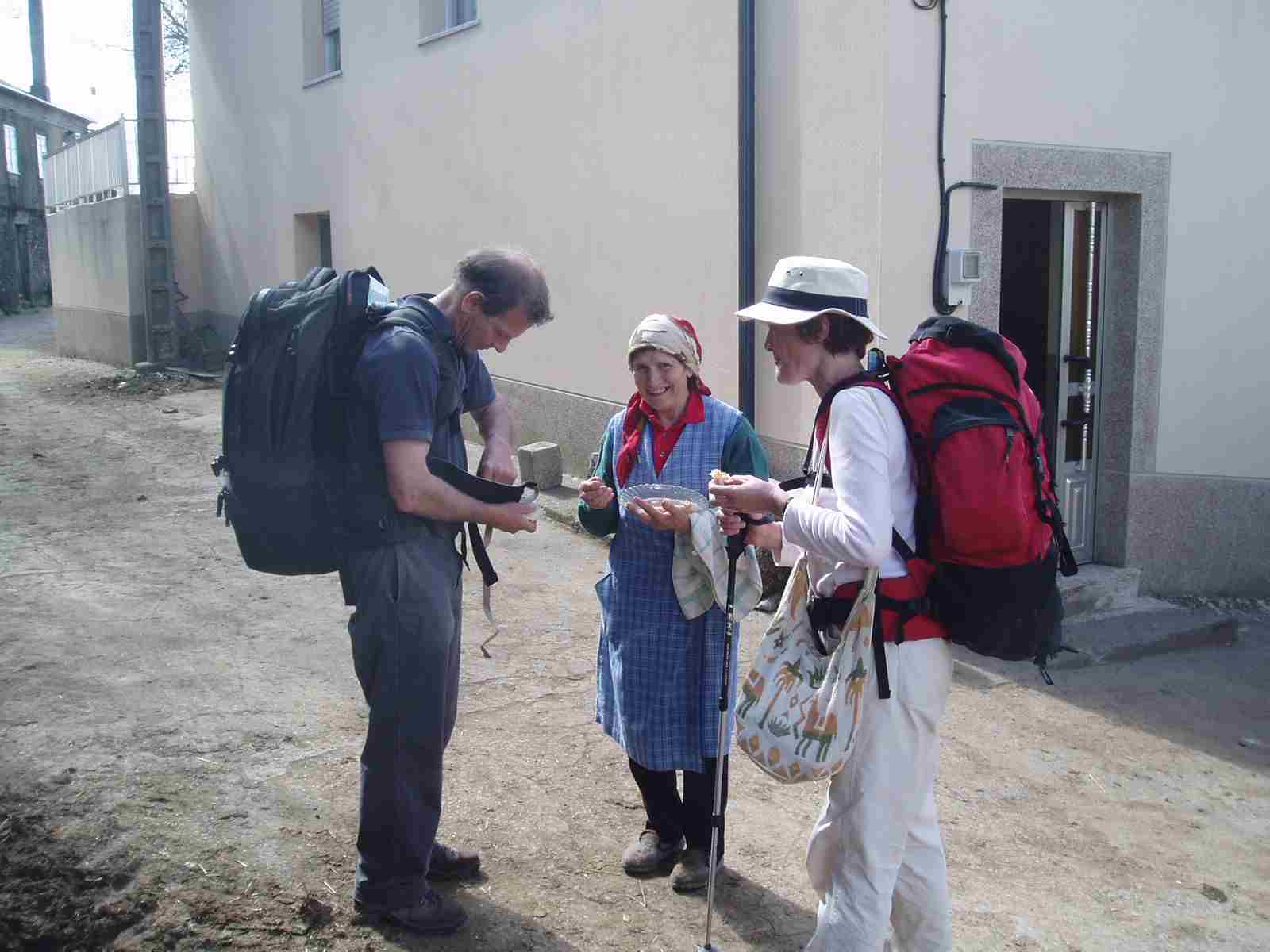 En Fonfría hacemos una pequeña parada mientras probamos las "filloas", riquísimas tortillas de pasta dulce, que nos ofrece una simpática mujer a cambio de nuestra voluntad. Muchos peregrinos se detienen a probarlas. Recuerdo que el año pasado Luis nos comentó que le había salido al paso la mujer y las había probado.