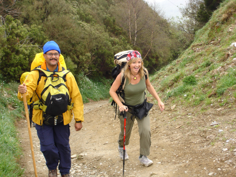 Aburridos por el interminable descenso decidimos "arrancar la moto" con intención de conectar con el grupo de sevillanos que caminaban algo adelantados. Pronto hemos conectado con las cuatro sevillanas y les hemos regalado las flores mientras continúabamos el descenso a una buena marcha. Saludamos a una peregrina belga que, sentada a los pies de un árbol, esperaba a otras dos amigas, aunque no sabía si iban por delante o por detrás. Mientras charlábamos con ella y tomábamos alguna foto han vuelto a pasarnos el grupo de sevillanas. Muy satisfechos hemos comentado que aún llevaban nuestras flores.