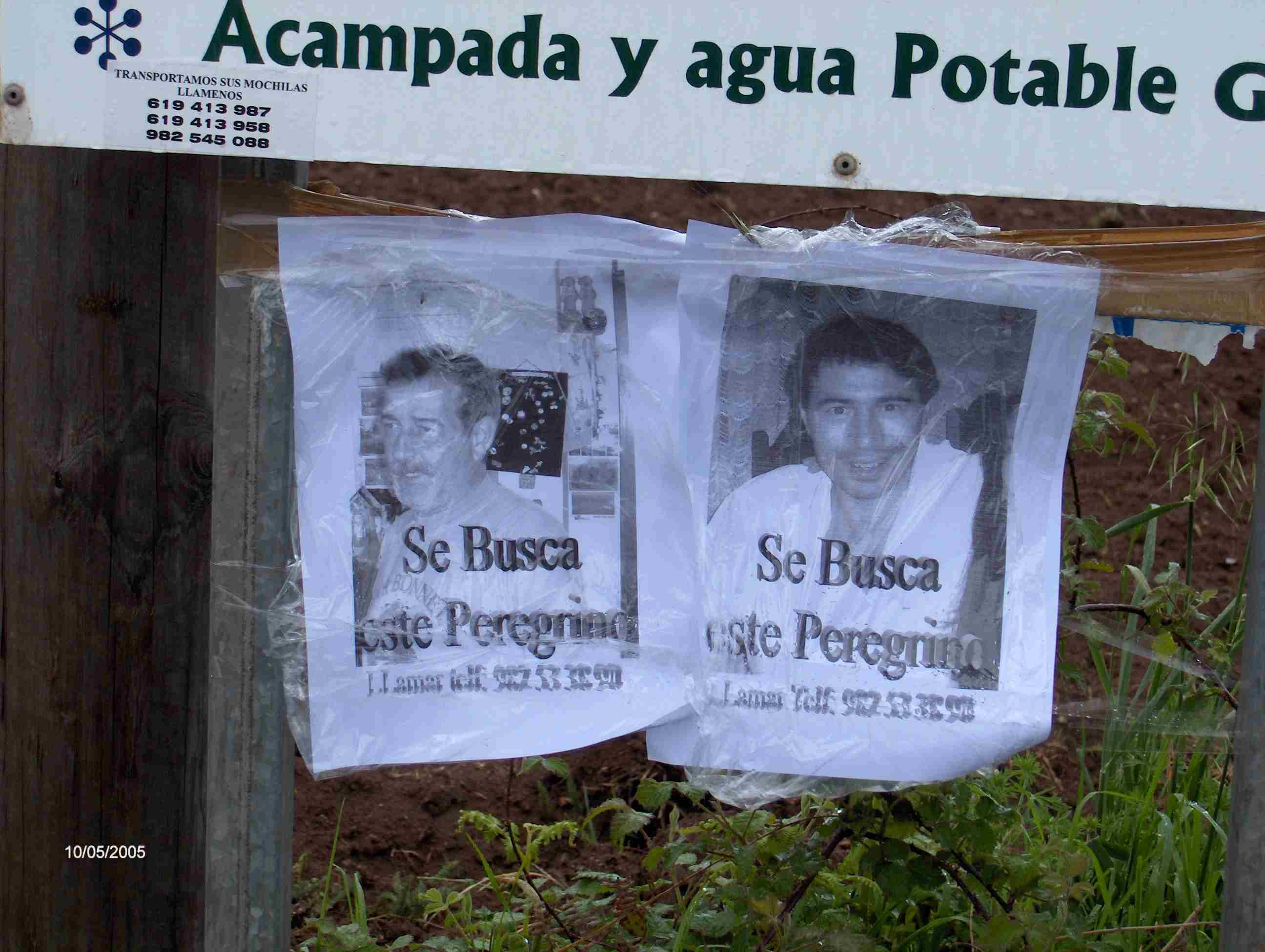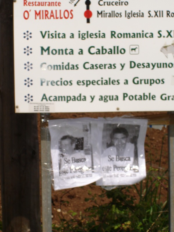 La lluvia comienza de nuevo y cubiertos con nuestros paraguas no nos fijamos en las fotos puestas en el cruce de la carretera cuando lo pasamos. A lo lejos vemos ya a nuestros amigos junto a Carmen, Sara y Simo que nos hacen señas sonrientes para que retrocedamos. Algo extrañados, volvemos sobre nuestros pasos y nos fijamos en un cartel de anuncios que nos reserva una gran sorpresa. Pegadas al cartel vemos dos grandes fotos plastificadas con nuestros rostros en las que dice: "Se busca este peregrino".