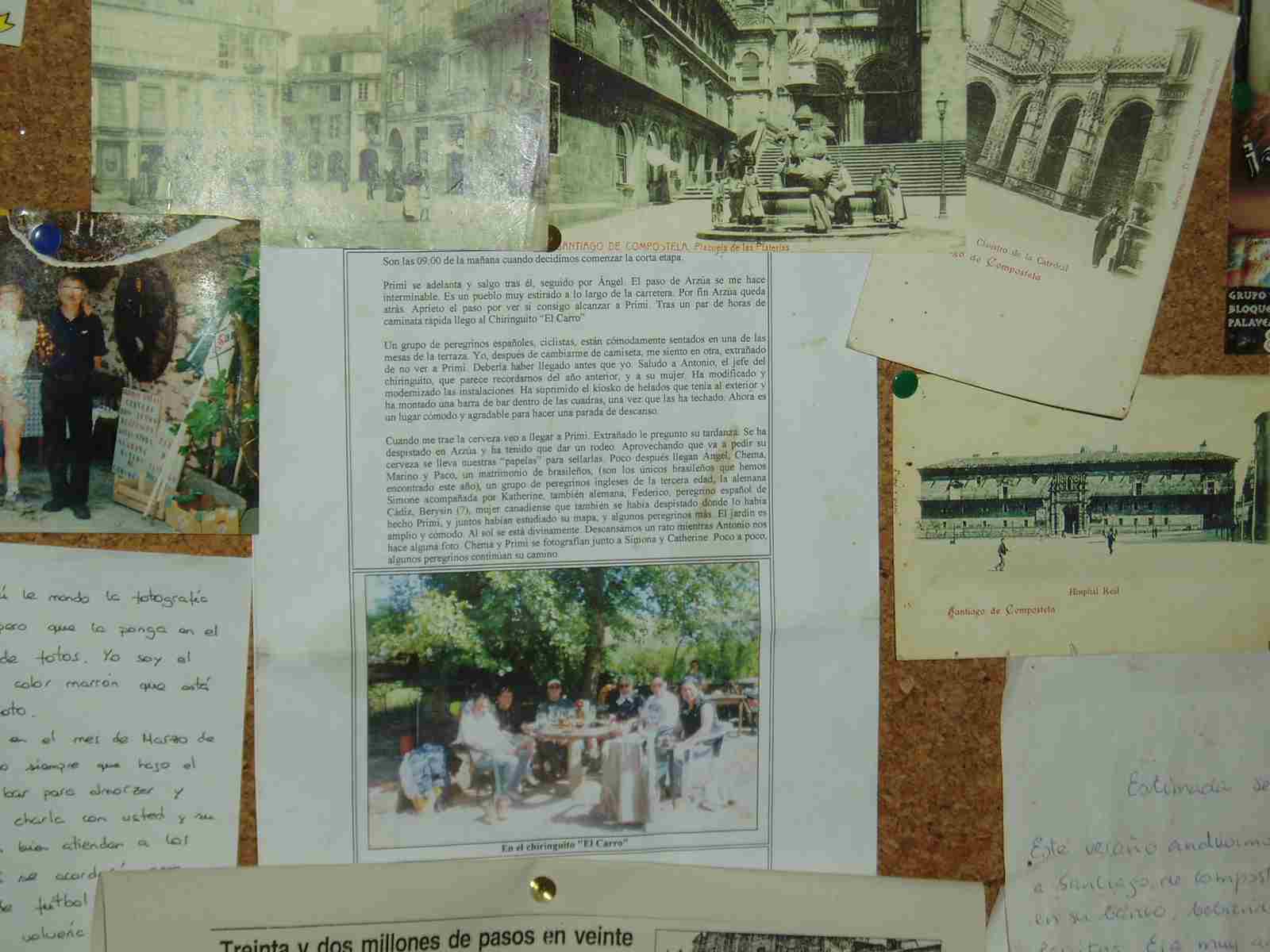 Llaman mi atención, en un tablón de anuncios de la pared del bar, algunas reseñas de peregrinos, varios escritos curiosos y algunas fotografías. Entre ellas se encuentra una nuestra de hace 2 años. Un folio, clavado con una chincheta en el tablón, donde estamos en una foto junto a unas líneas escritas antaño por Michel referidas al lugar. Alguien lo ha sacado de nuestra página de Internet y lo ha puesto allí. Lo leo en voz alta y nos hace mucha ilusión.