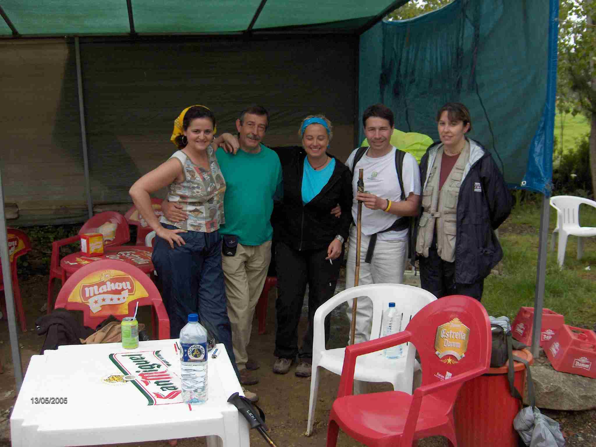 Por fin, Ángel, Michel y yo decidimos continuar la marcha pero, en ese momento, llegan a la terraza Anabel, Meli y Loli, peregrinas de Marbella y Madrid, acompañadas por Feliciano, también de Madrid, a quienes, volviendo a entrar en el bar, mostramos nuestra reseña, les comentamos sobre nuestra página, y aprovechamos para hacernos algunas fotos.