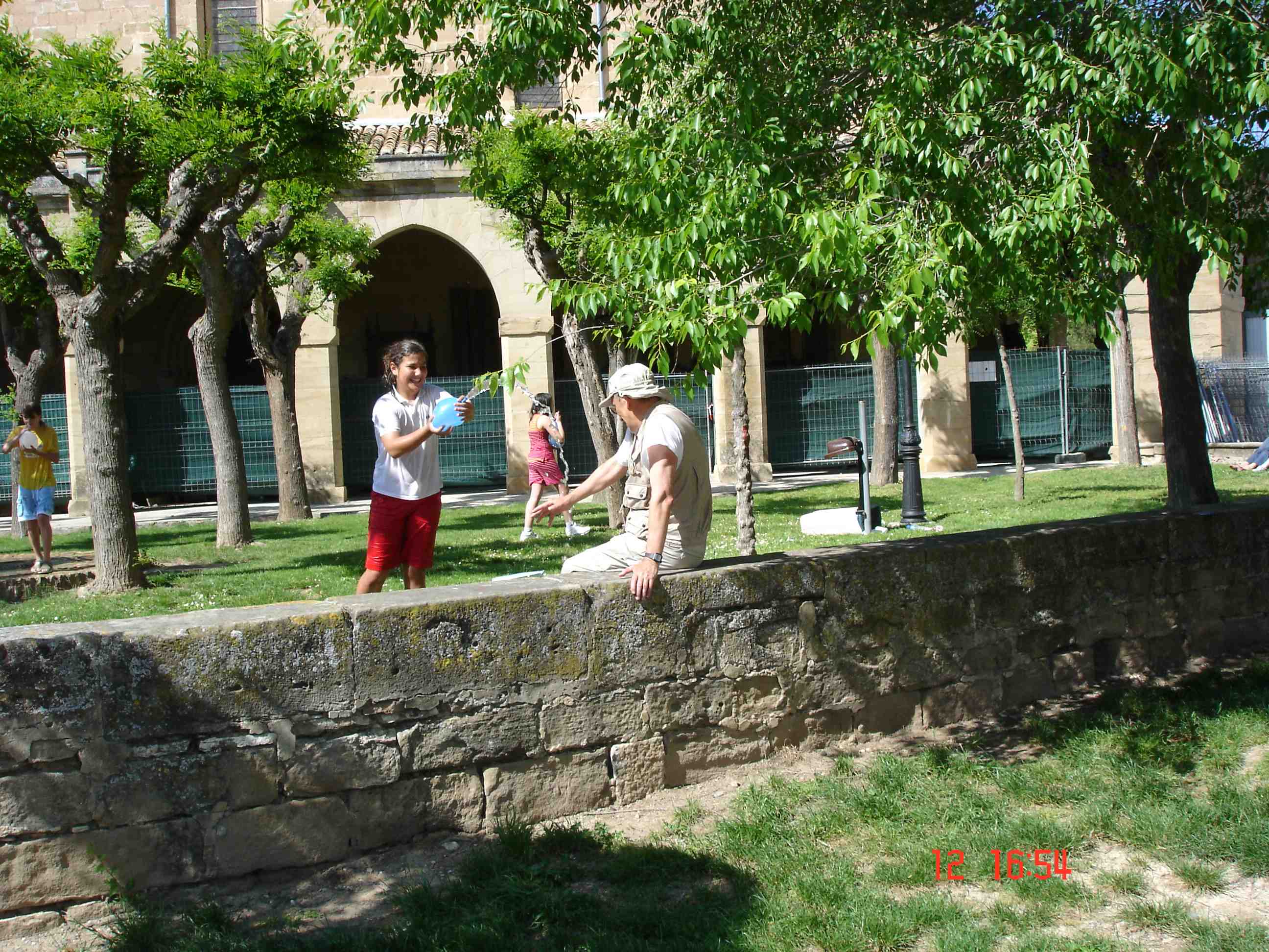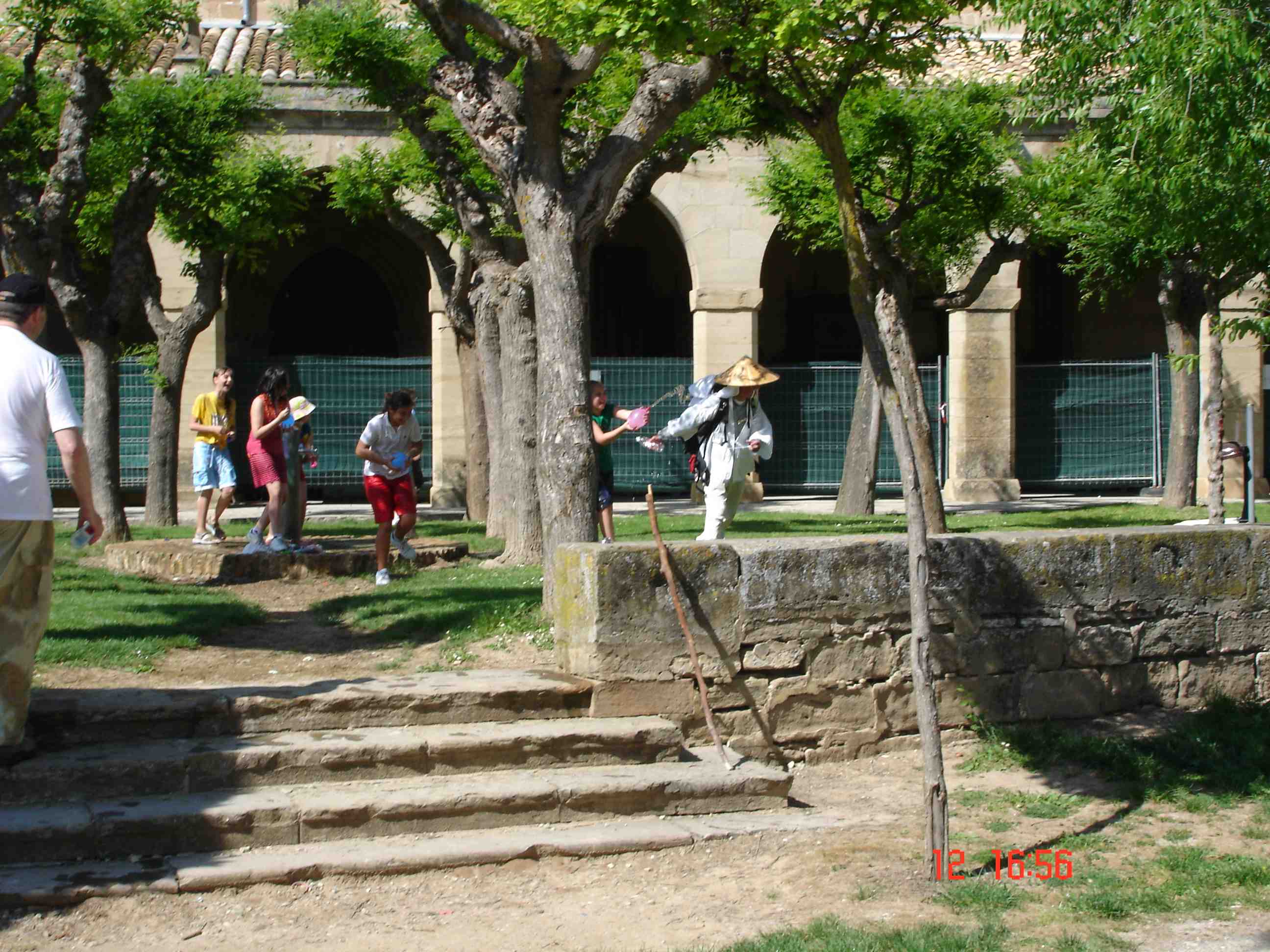 las niñas a mojar con los globos a los peregrinos cosa que ellas no dudan ni un