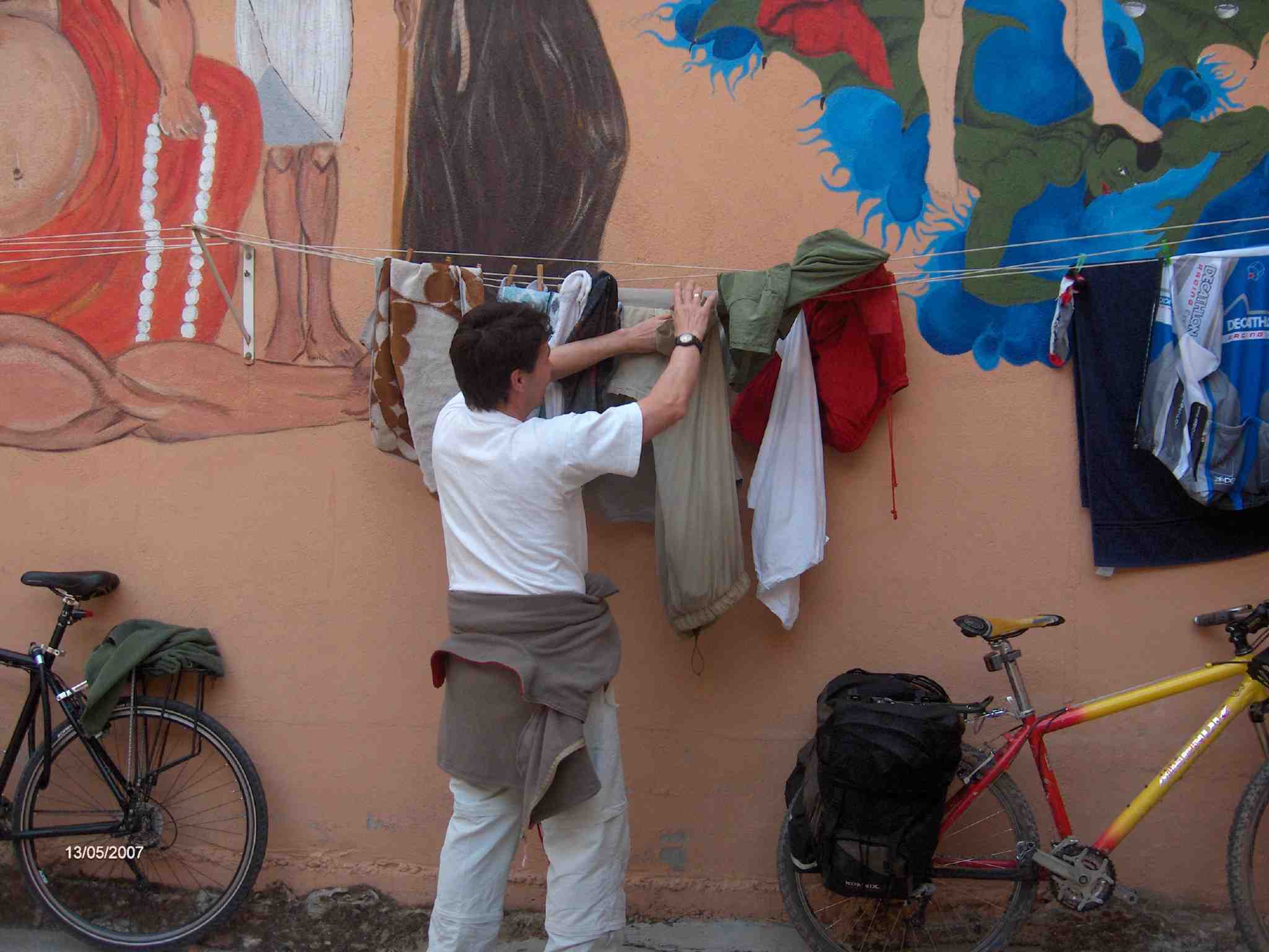 cuidadoso, tiende la colada en las cuerdas del albergue sin imaginar que por la noche llovería.