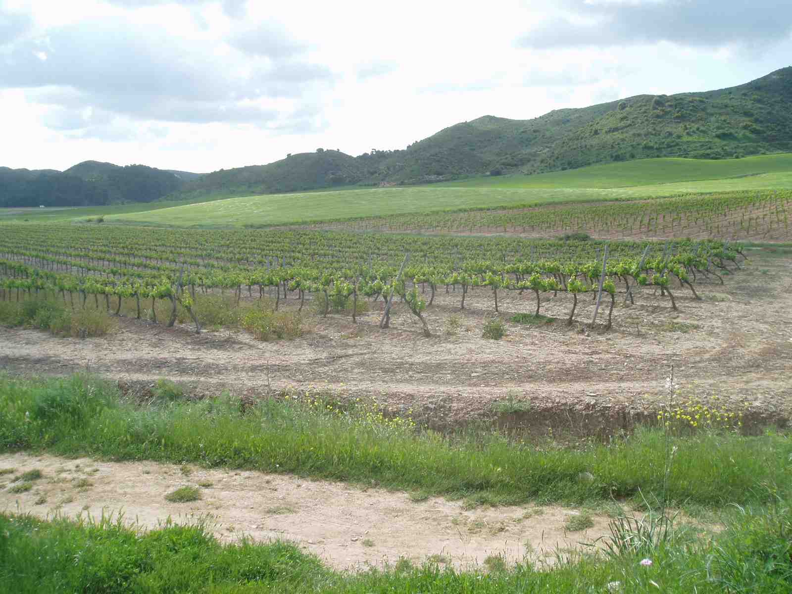 Fuente de los Moros y los extensos viñedos, con sus cepas perfectamente alineadas y bien cuidadas
