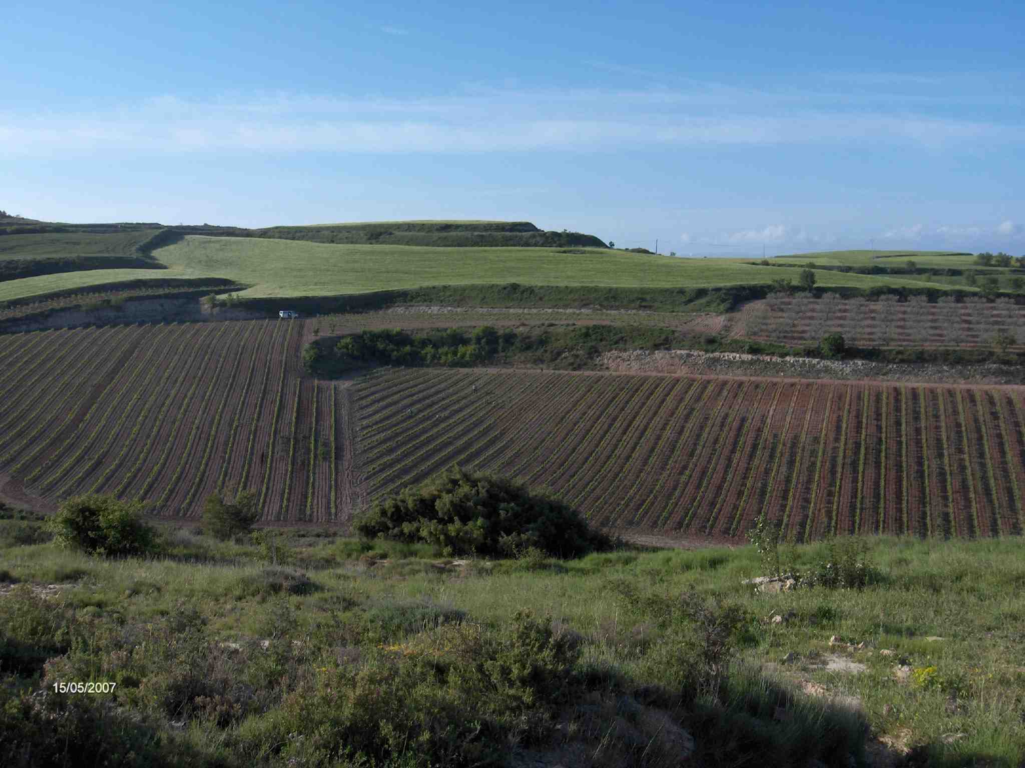 un terreno llano cubierto de extensos campos de viñedos y verdes sembrados.