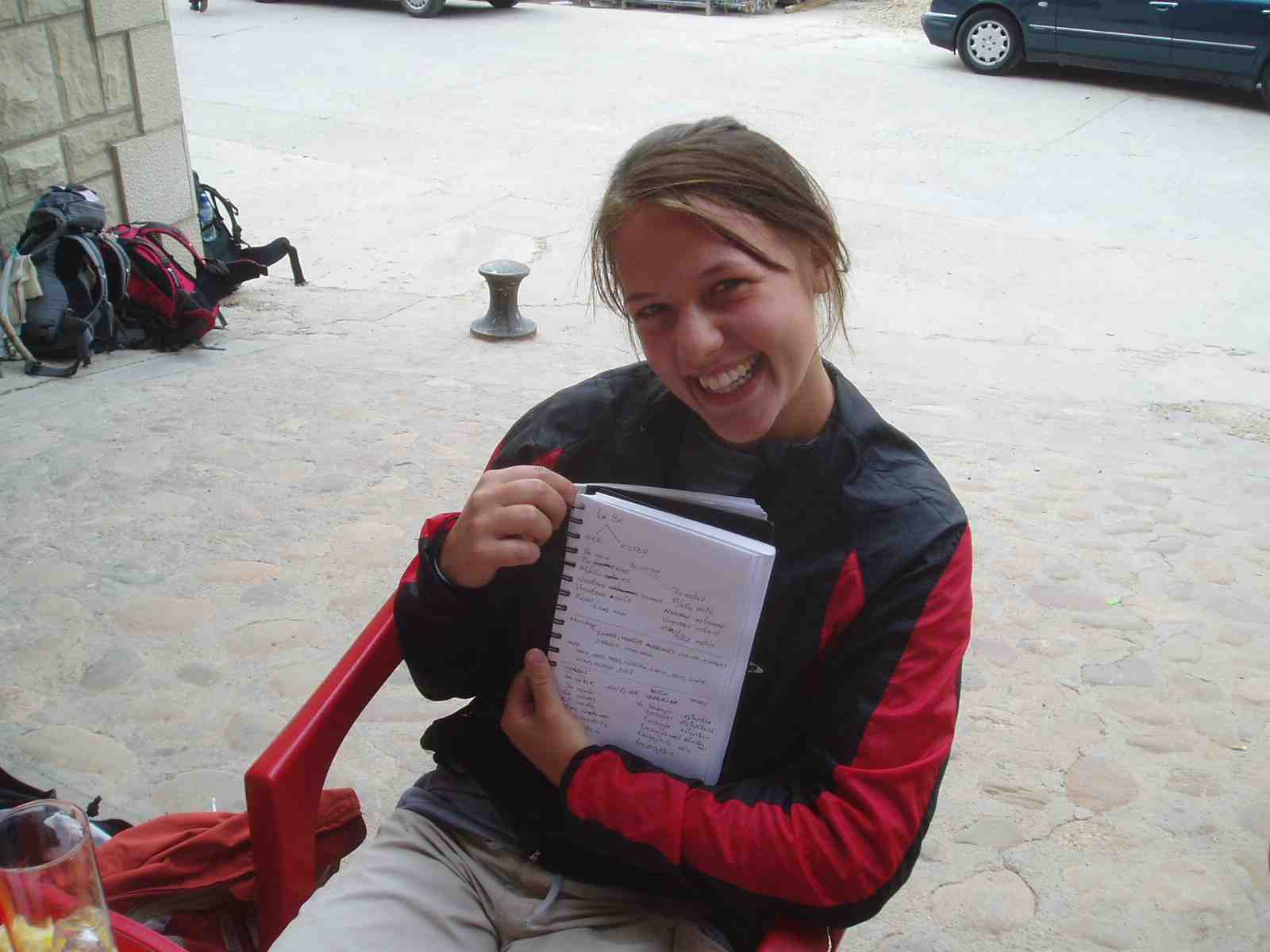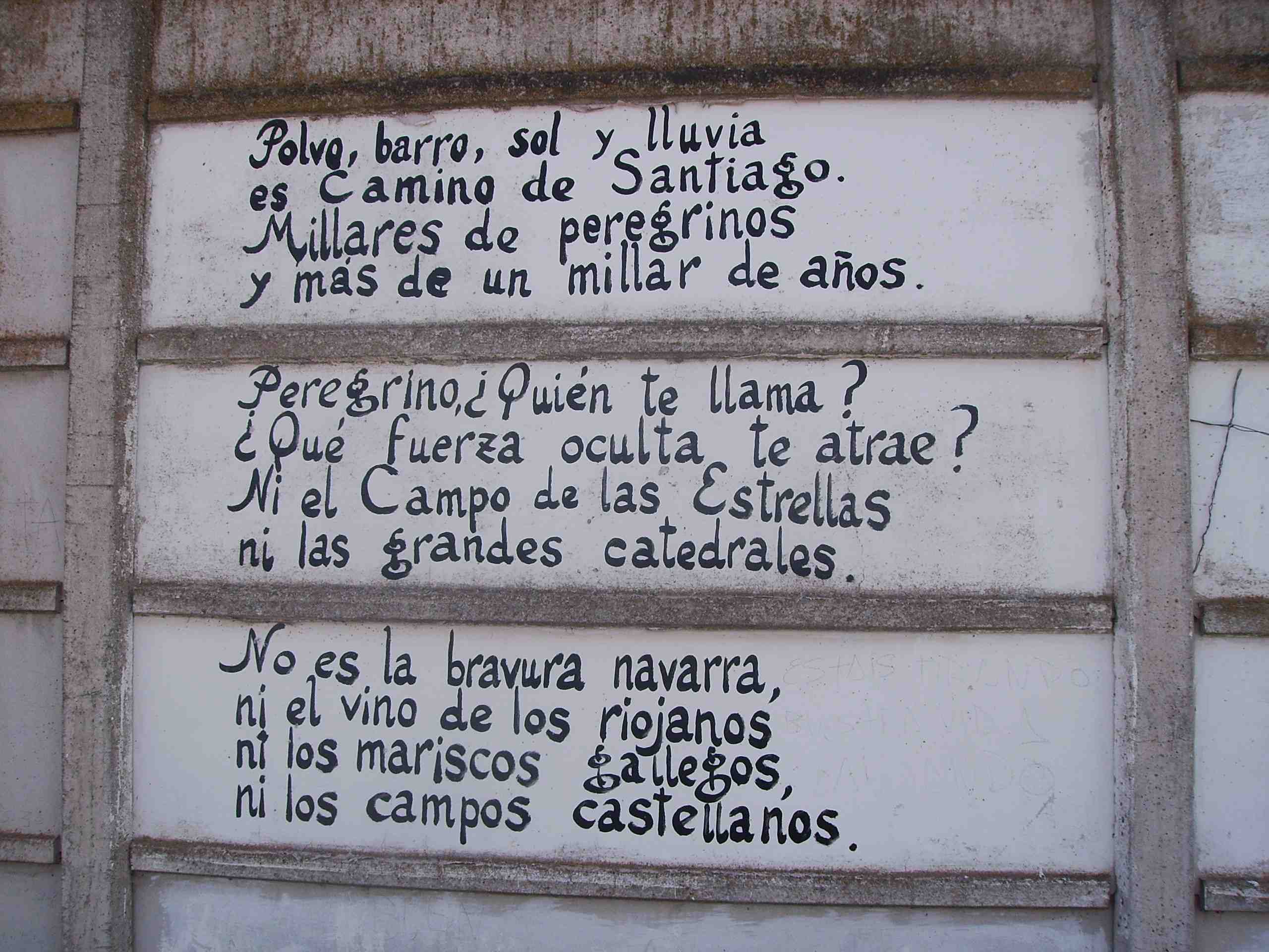 contemplando la poesía que sobre peregrinos han escrito en un muro.