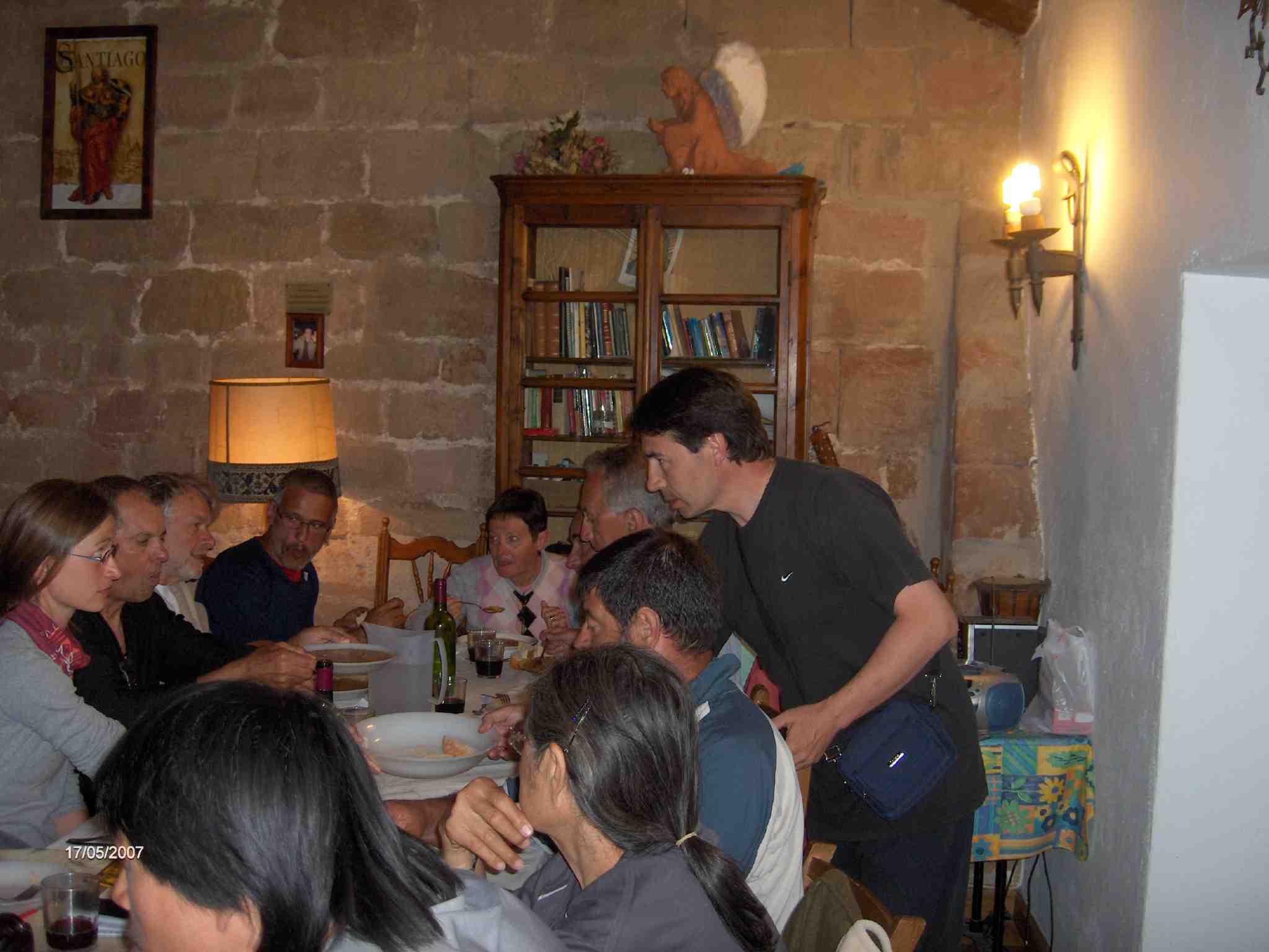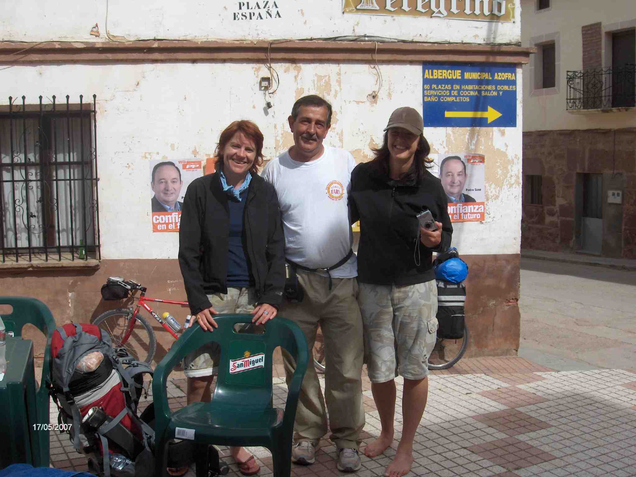 sentarse. Jose Luís, el hospitalero, le ofrece un vaso de agua con