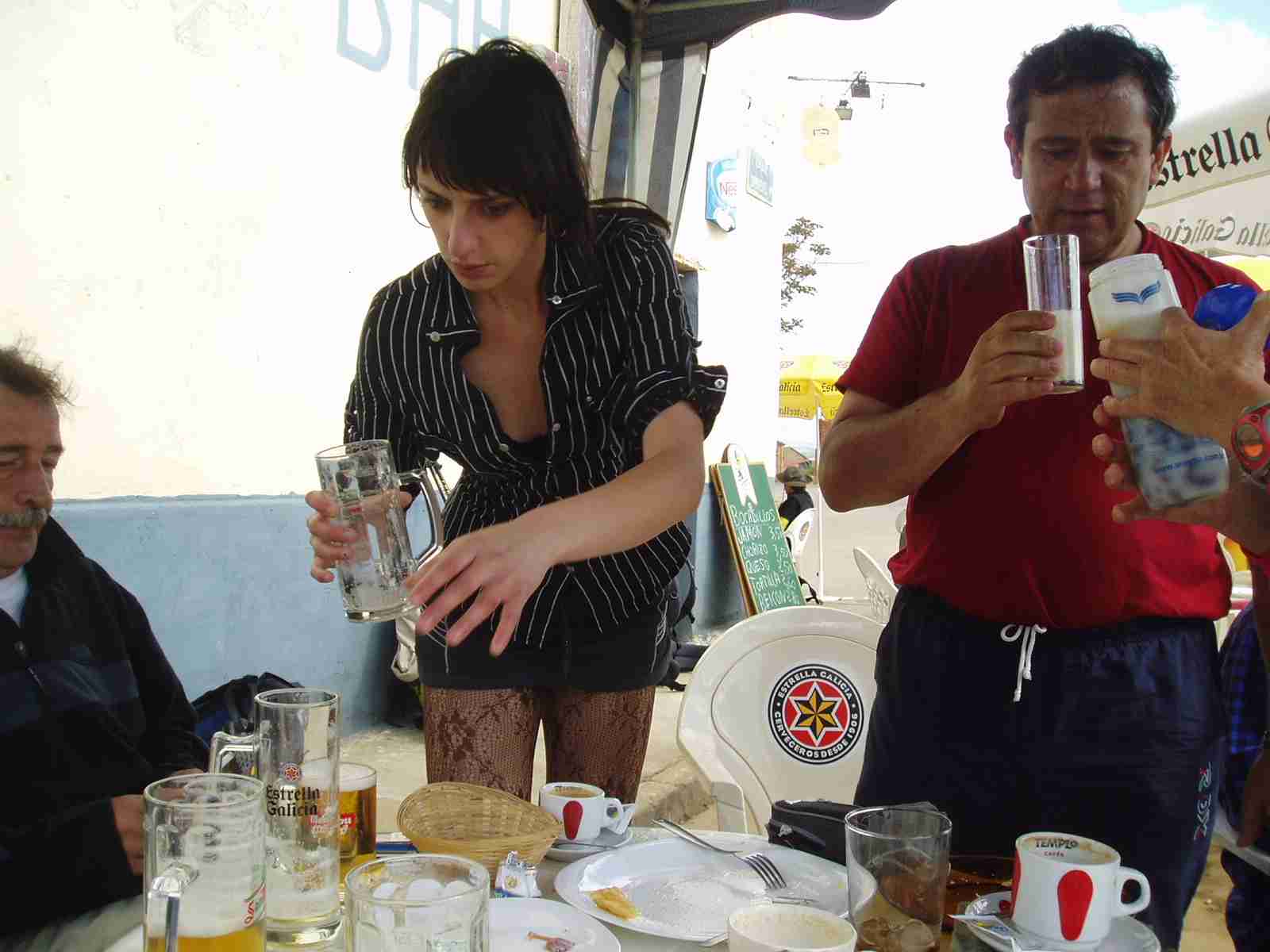 bajo una de las sombrillas, Luís entra a pedir unas cervezas. Sale sonriente