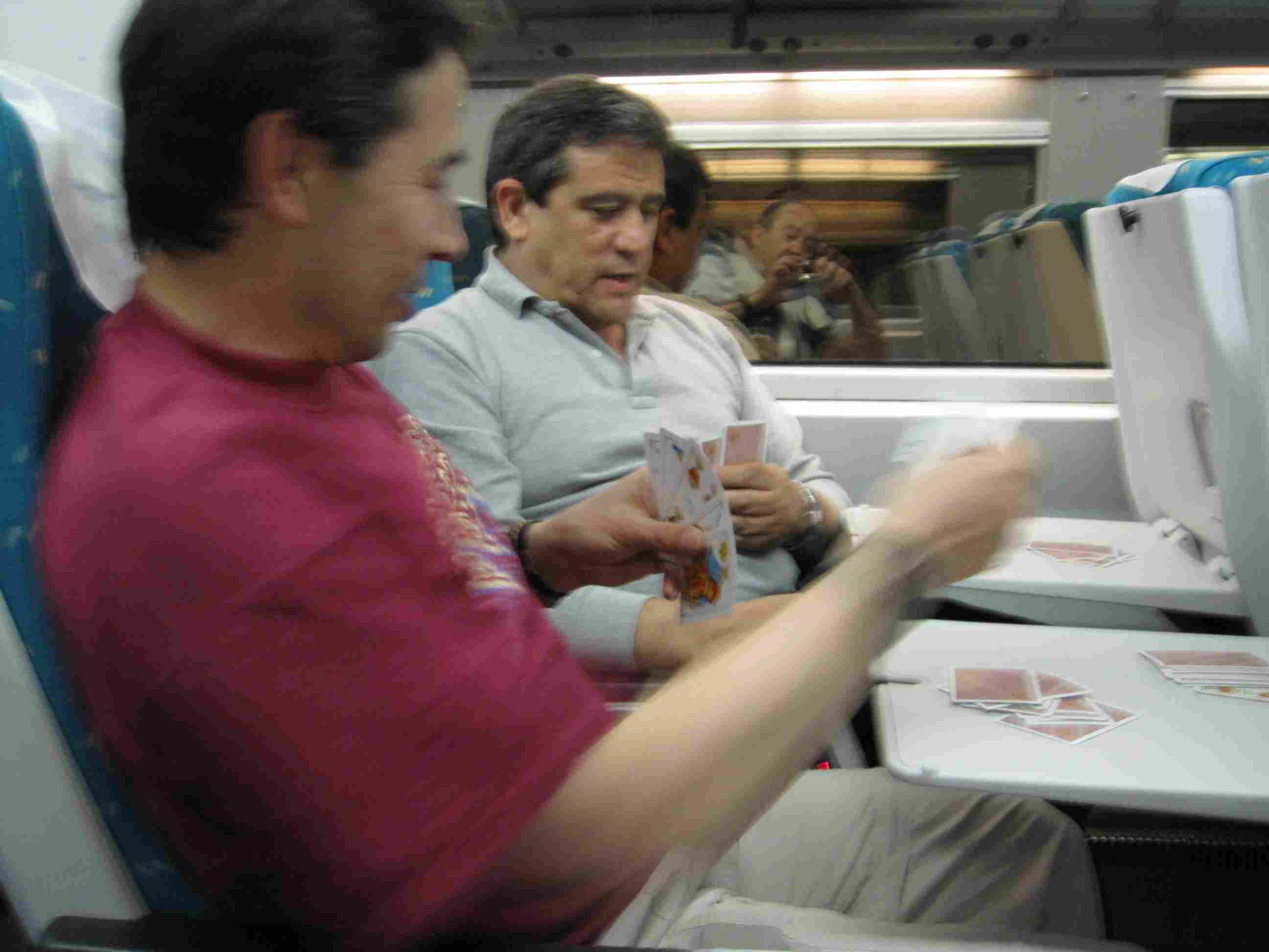 Mientras algunos ven la película en la televisión otros se entretienen jugando al Tute. El tren avanza rápido.