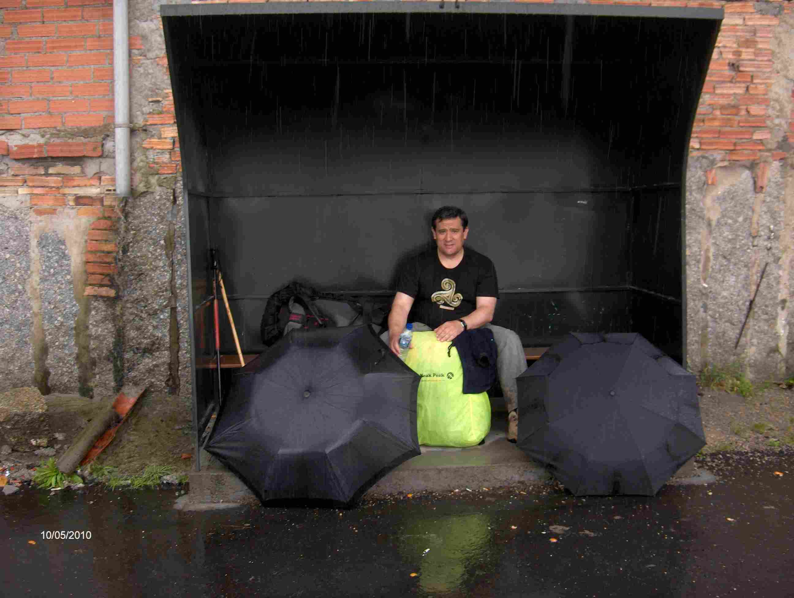 Nos resguardamos del fuerte aguacero bajo una parada de autobús esperando a
