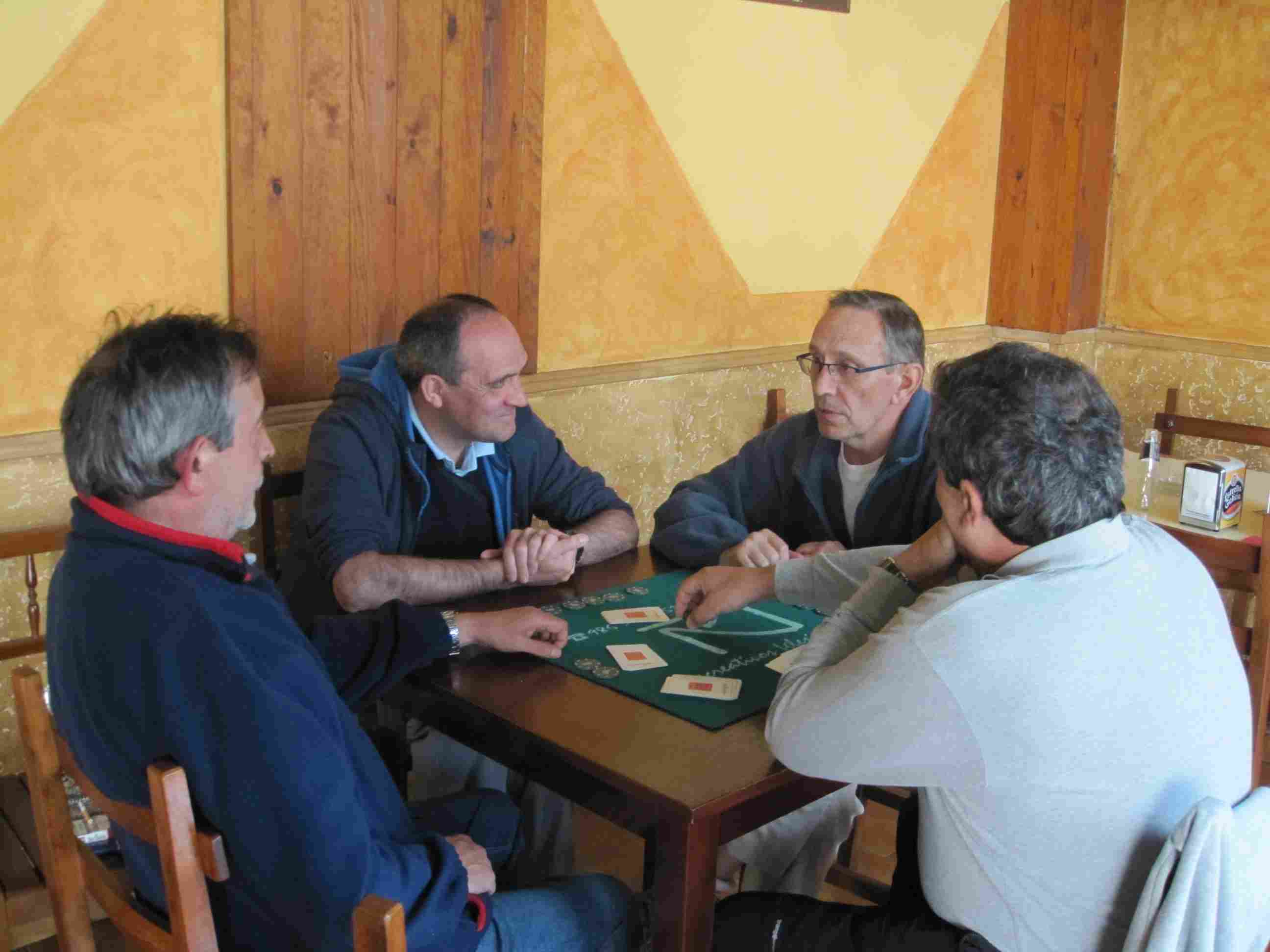 Después de comer unas empanadas y algunos otros pinchos echamos una interesante partida de mus. Chema y Michel