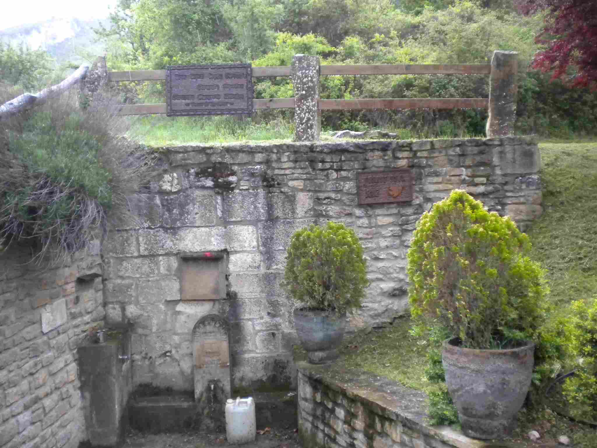 Ha comenzado a llover con fuerza. Dejamos atrás una bonita fuente (con agua), y nos resguardamos en el porche de una iglesia,