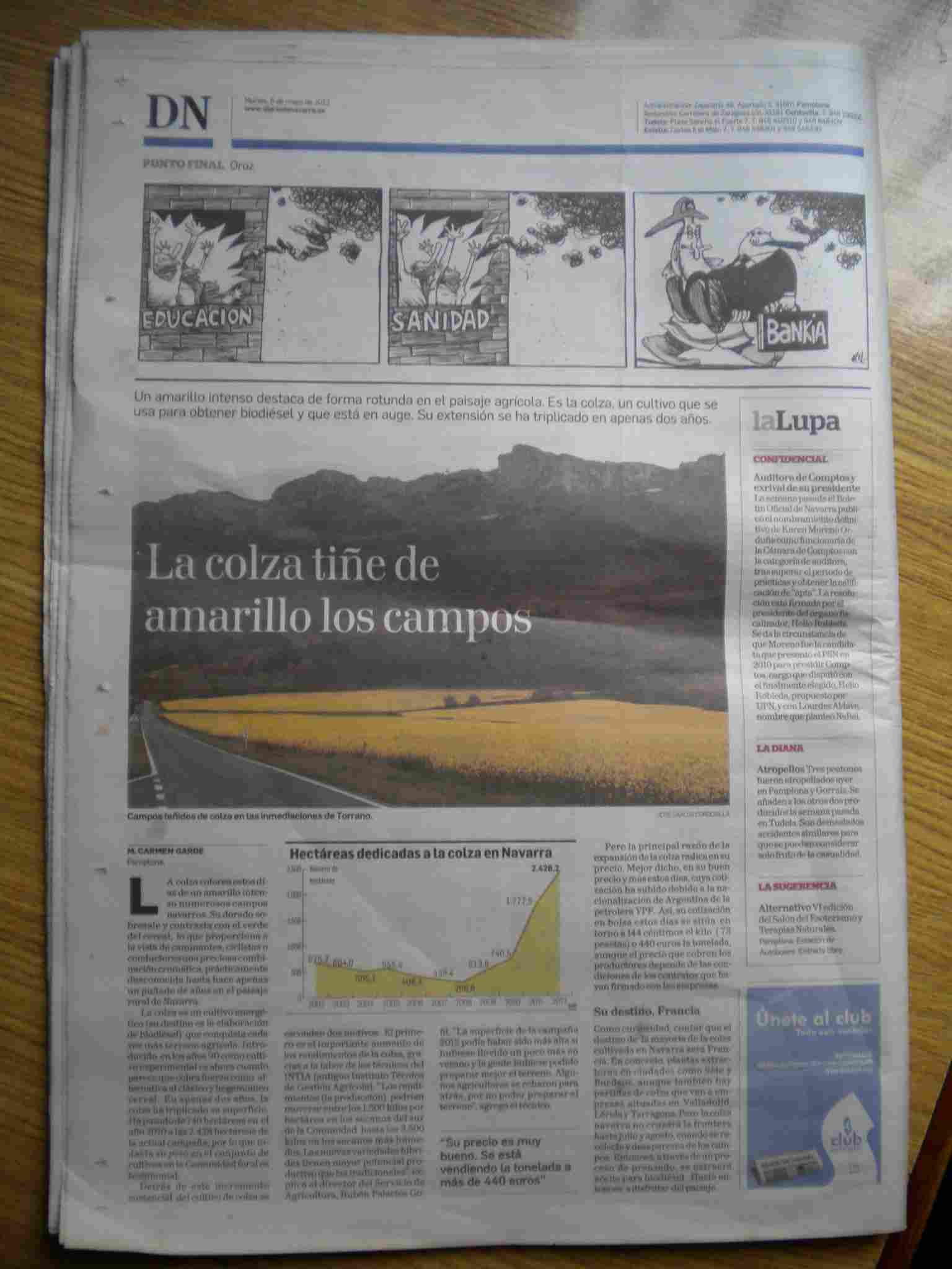 Mientras descansamos leemos un curioso artículo en un diario sobre la colza y los campos amarillos.