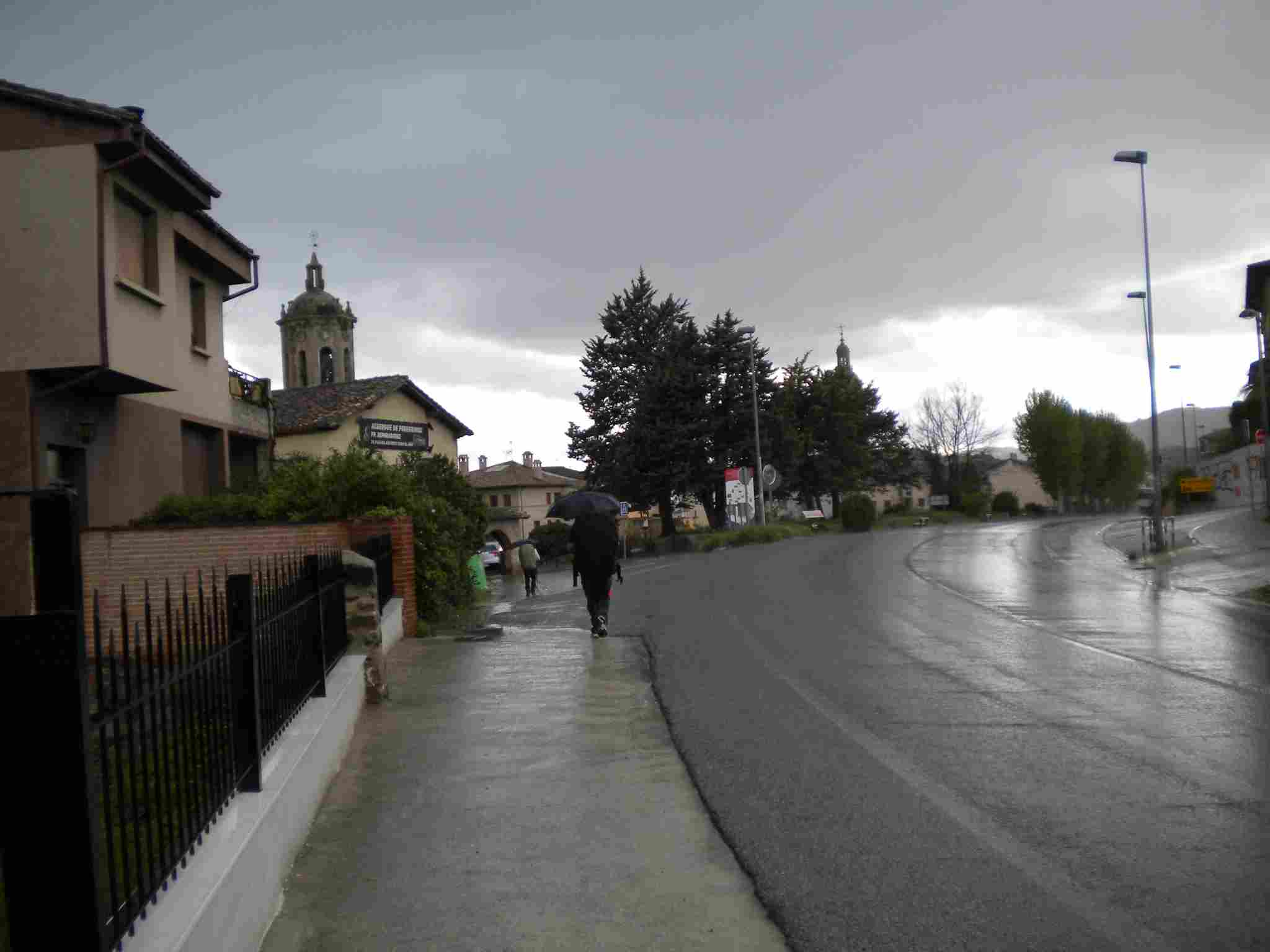 Cuando continuamos hacia Puente la Reina comienza a llover. Entramos en la población bajo nuestros paraguas y directamente