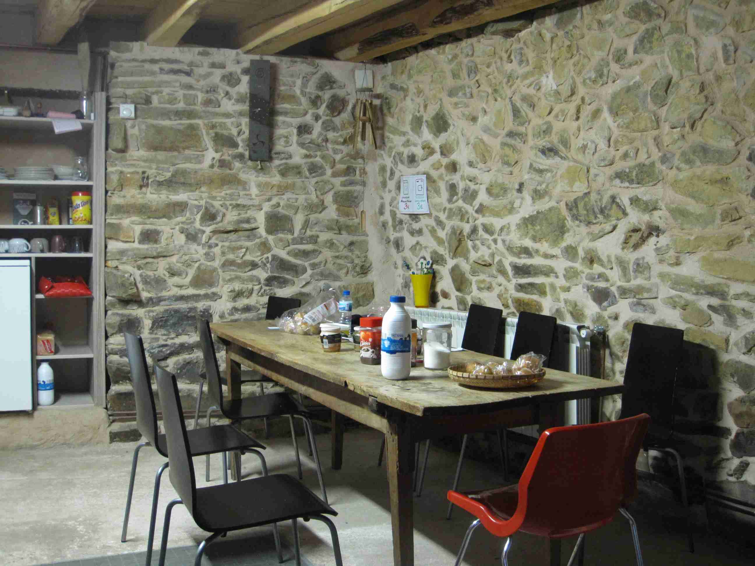 El desayuno se hace en el propio albergue, en el hall que está debajo de nuestras camas. Había cefé, leche, tostadas,