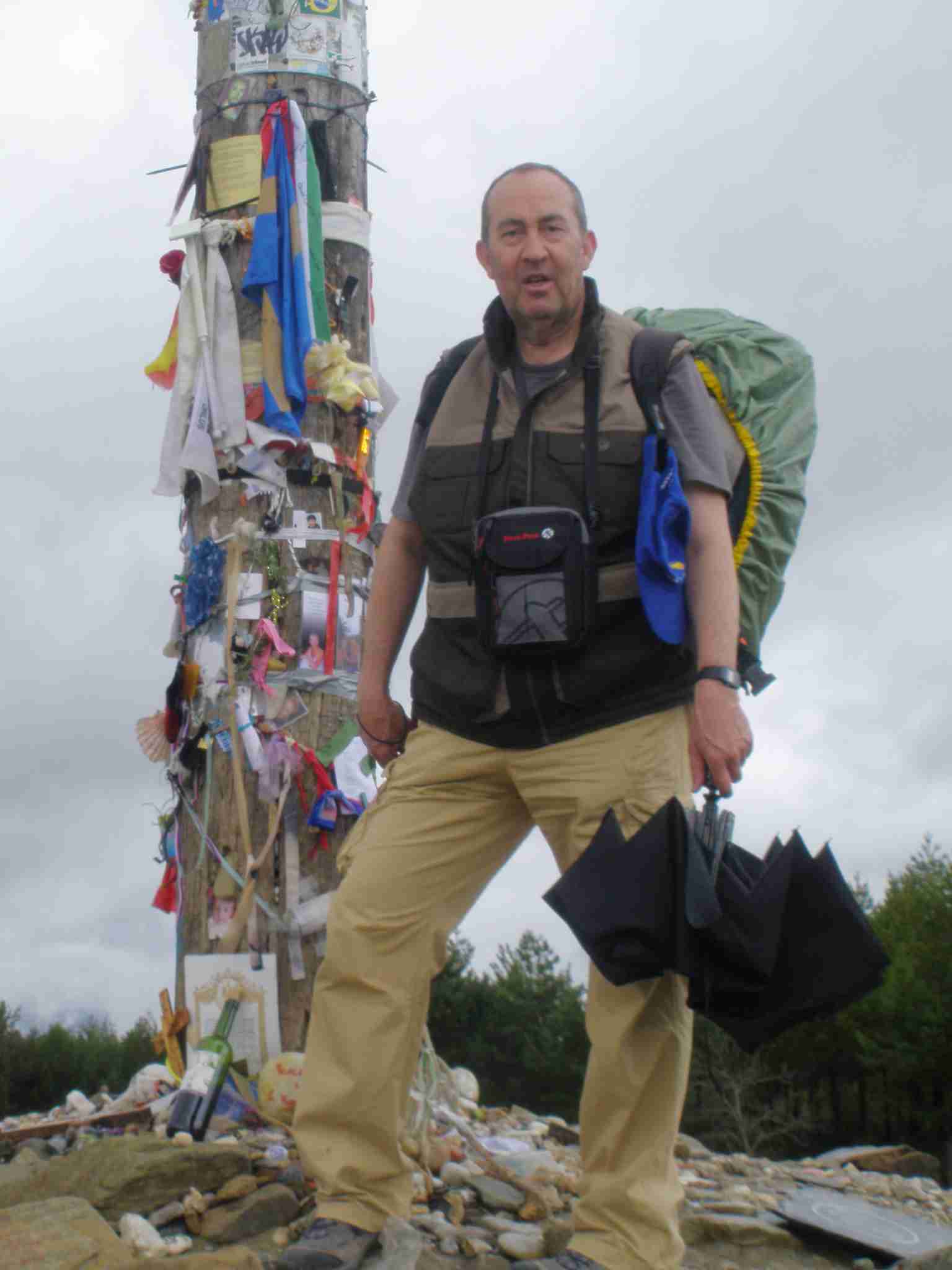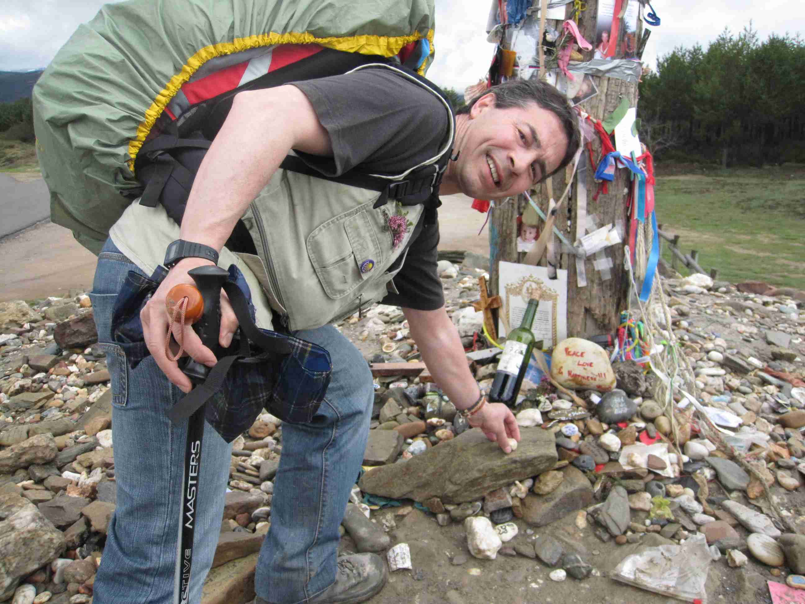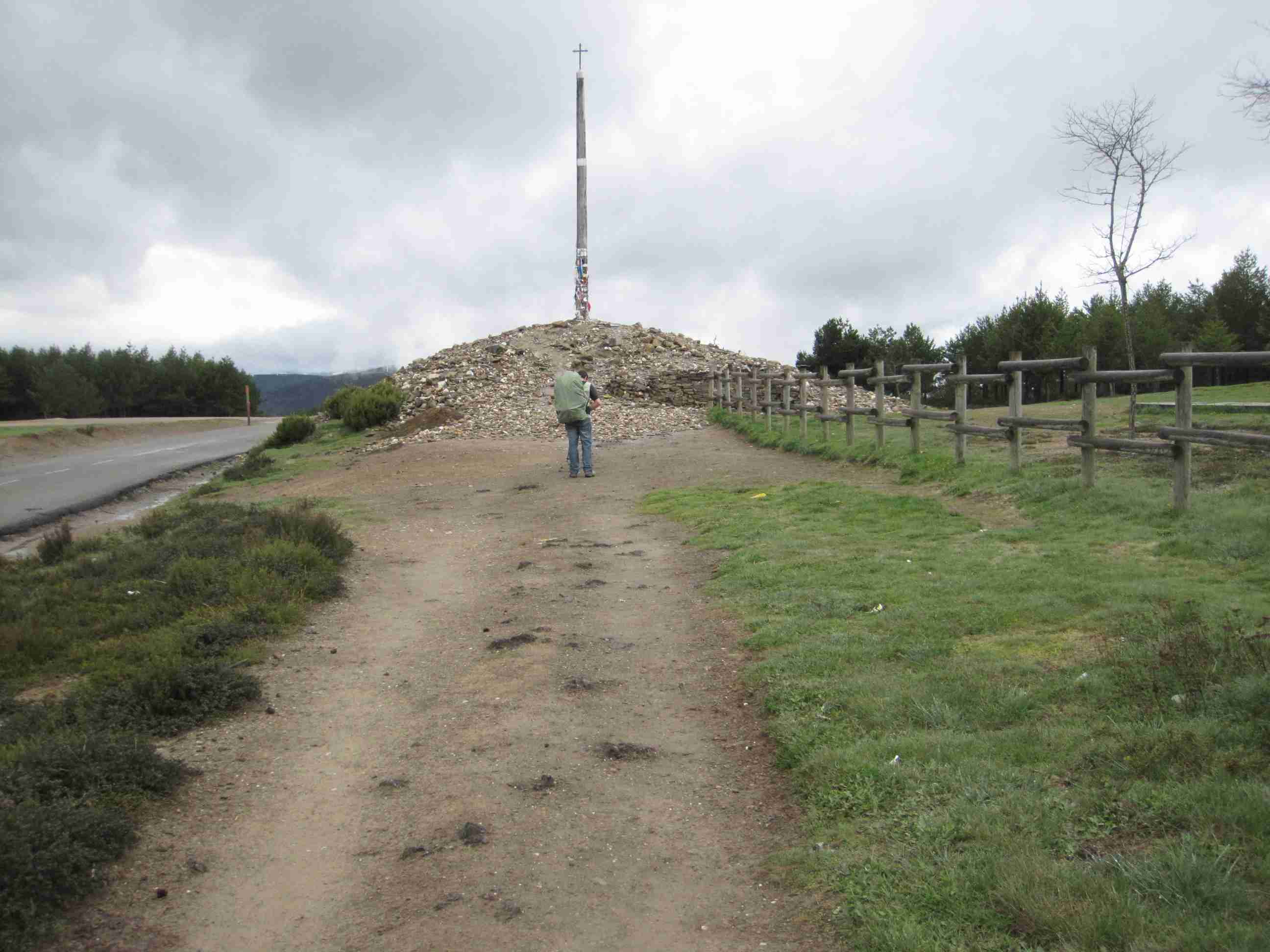Continuamos hacia la Cruz de Ferro, donde Primi deposita una piedra que ha traido de Segovia. El cielo está encapotado y