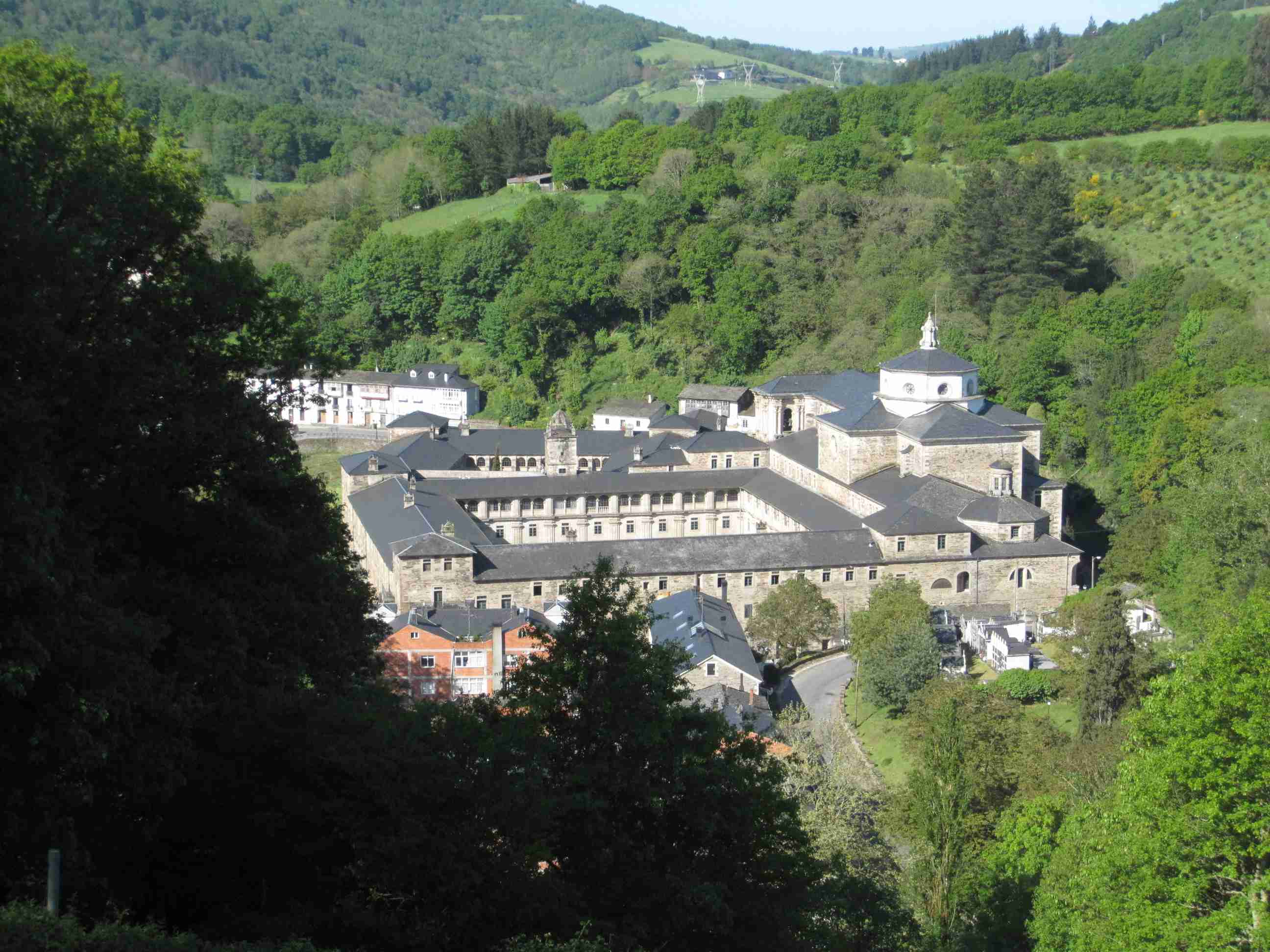 Primera parada en Samos. Cervezas y bocadillo de tortilla de chorizo en una terraza al sol frente al Monasterio, por lo