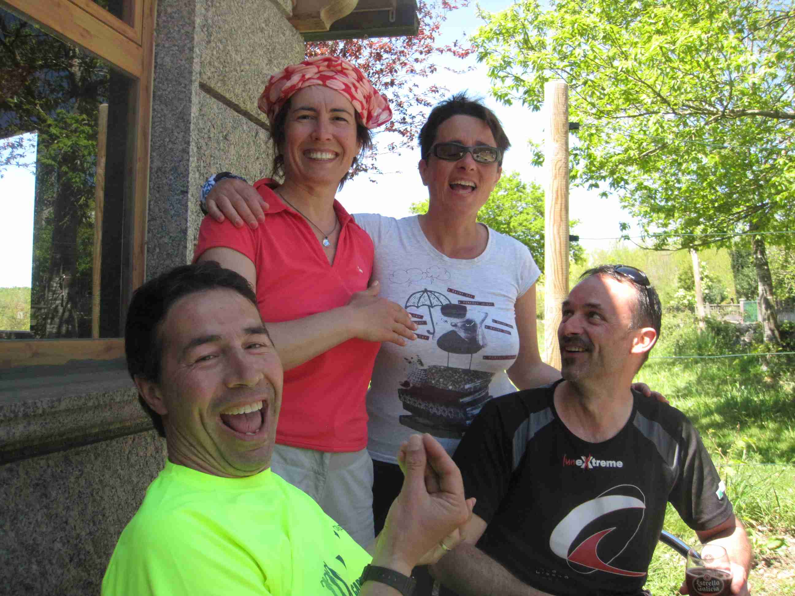 Parada en la terraza del mesón Conde de Valdemar, frente al albergue de Eirexe; vinos y prácticas de italiano por parte de