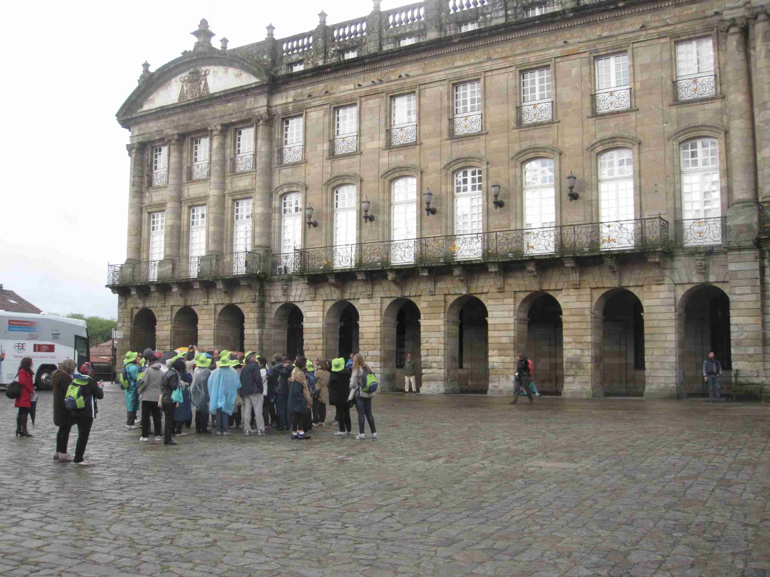 Grupo de peregrinos en la Plaza del Obradoiro bajo la lluvia