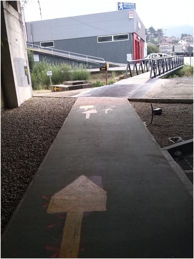 Cuando llegamos a O Porriño dudamos si debemos cruzar un puente o no, pues las flechas, algunas borradas, nos confunden.