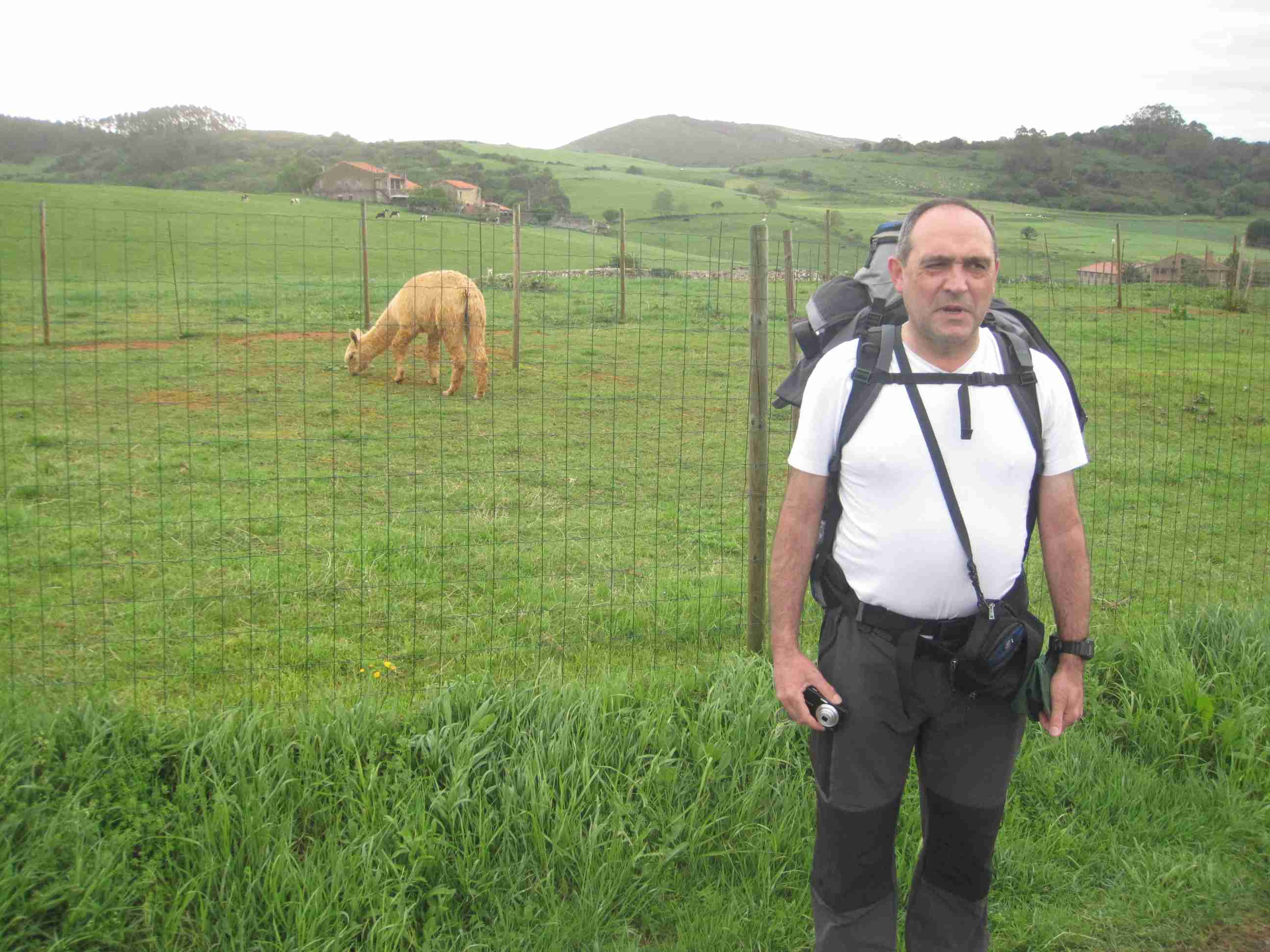 Adelantamos a los valencianos, pues han salido antes que nosotros. Uno de ellos se llama Ramón. Pasamos algunas fincas con animales pastando que nos recuerdan a las llamas del Perú. Son "alpacas", animales desconocidos en España apreciados por sus fibras de alta calidad y que están introduciendo en algunas granjas de Cantabria. Poco después, dejamos atrás El Arroyo, pequeña población cántabra.