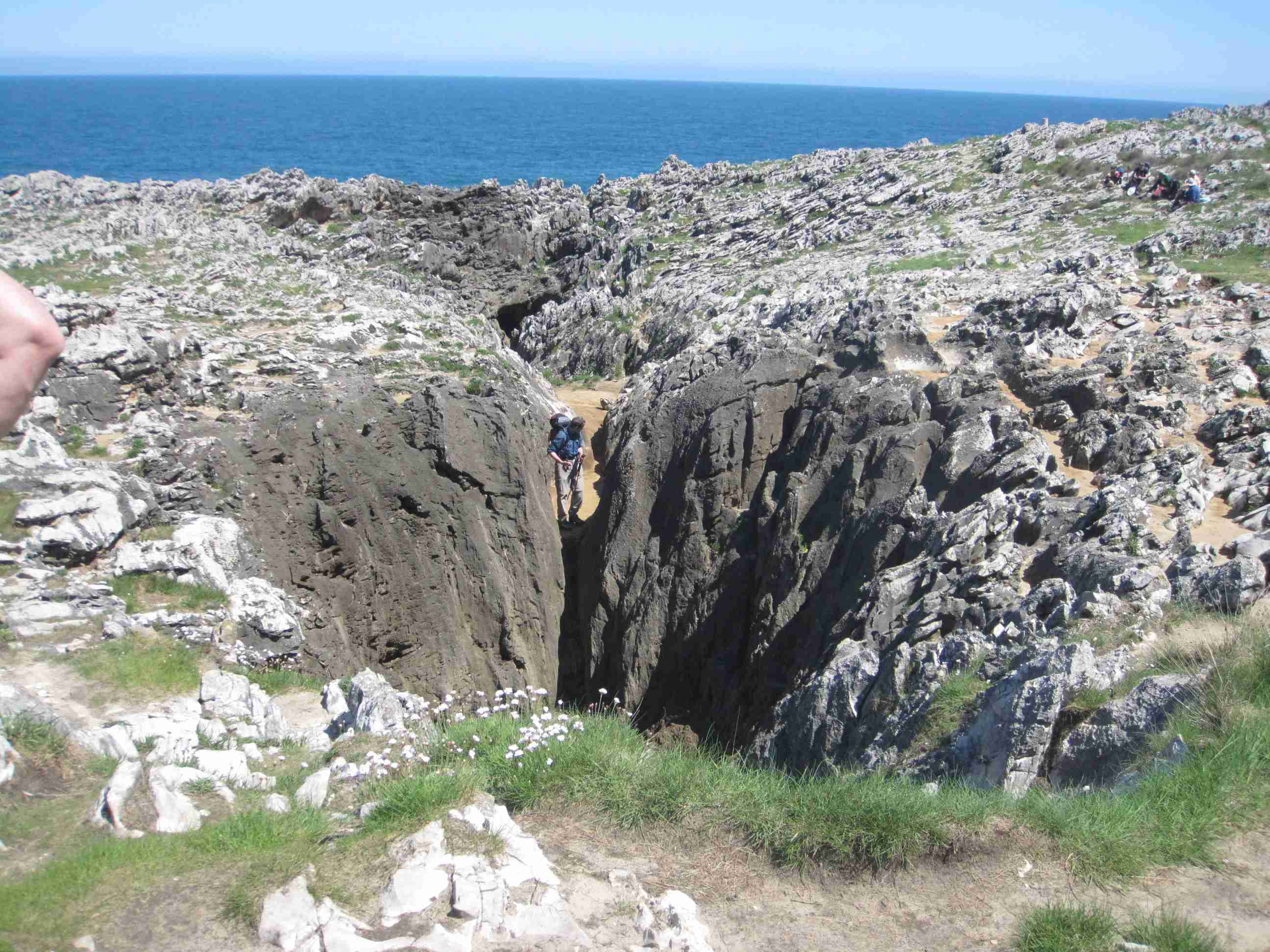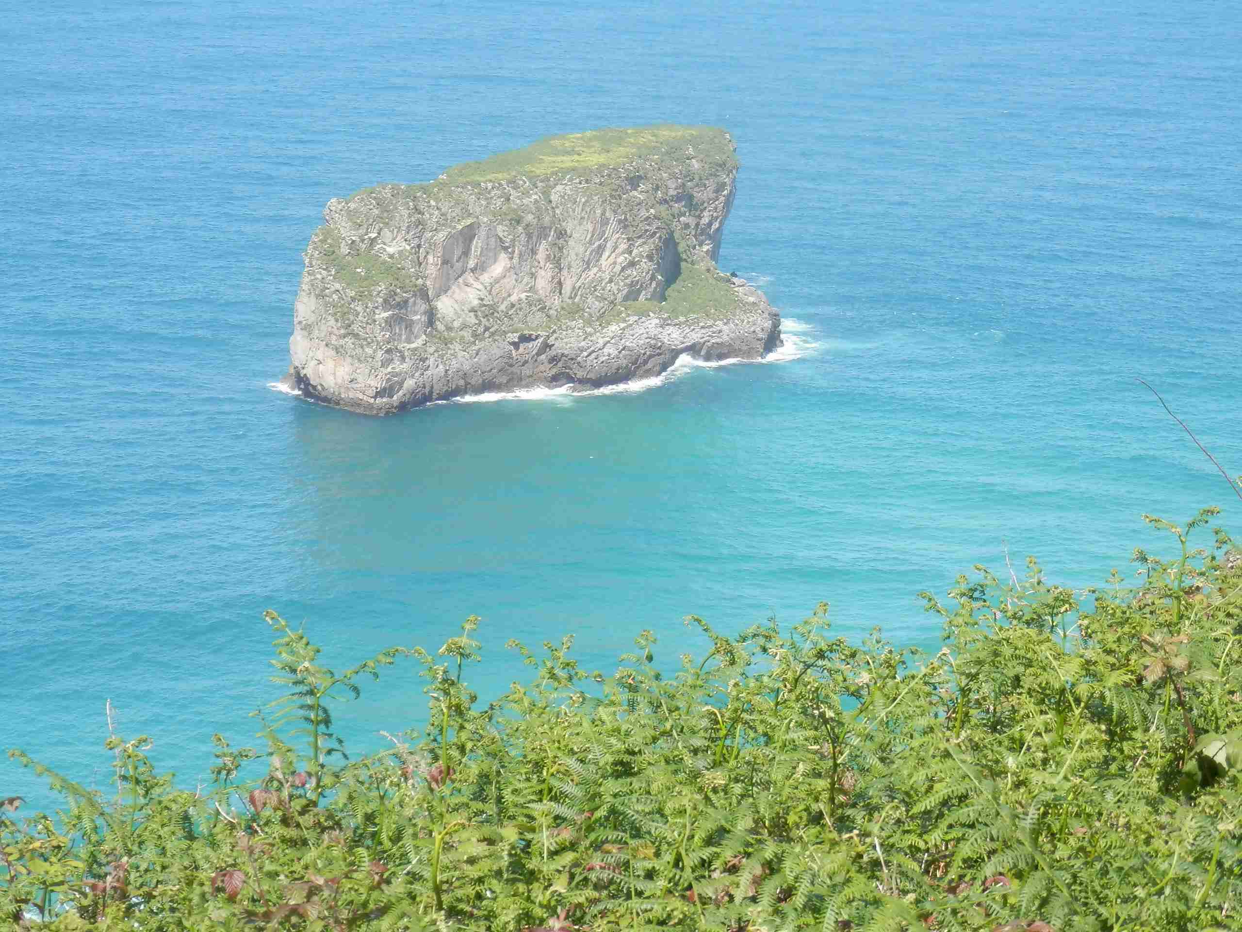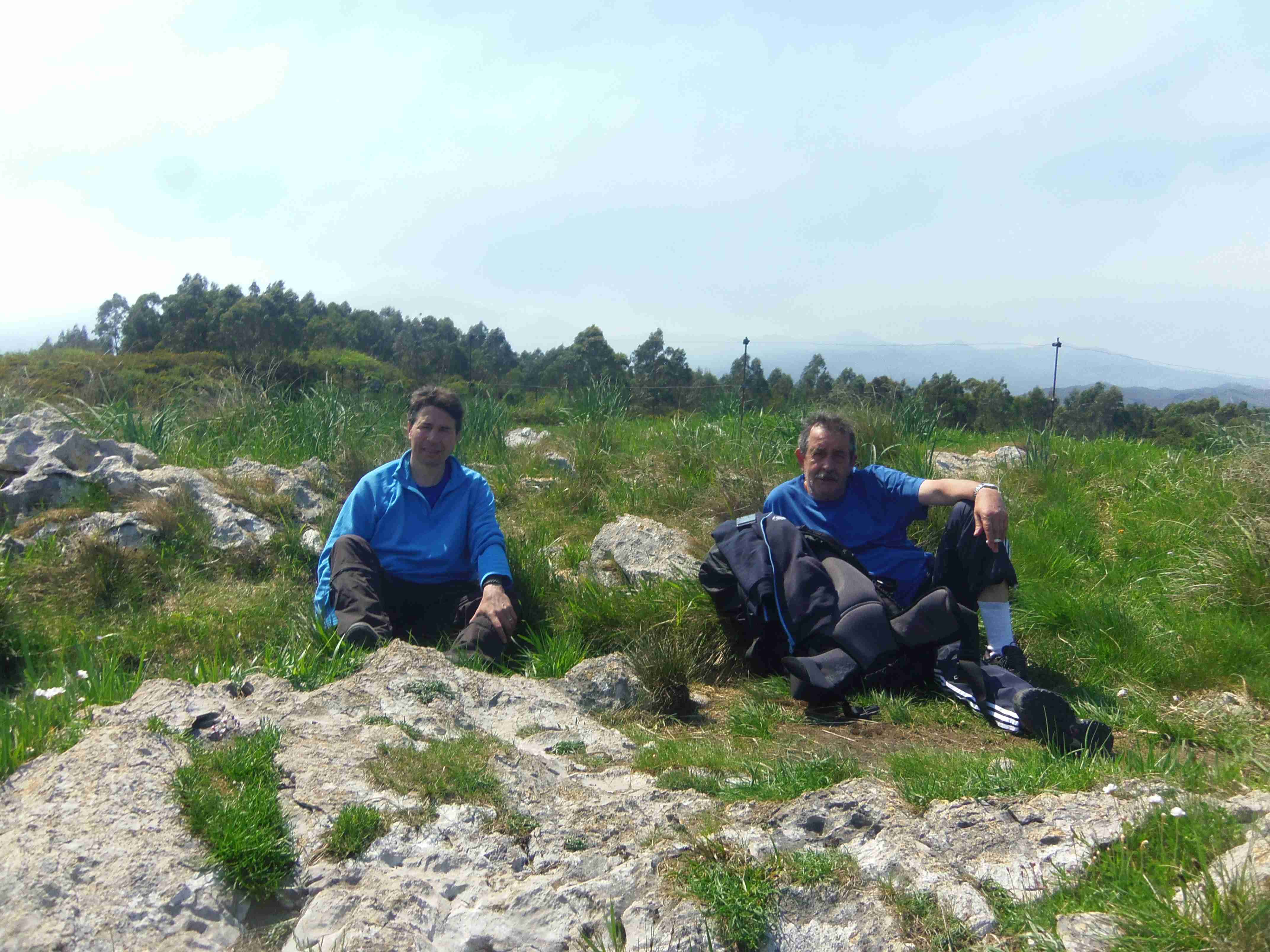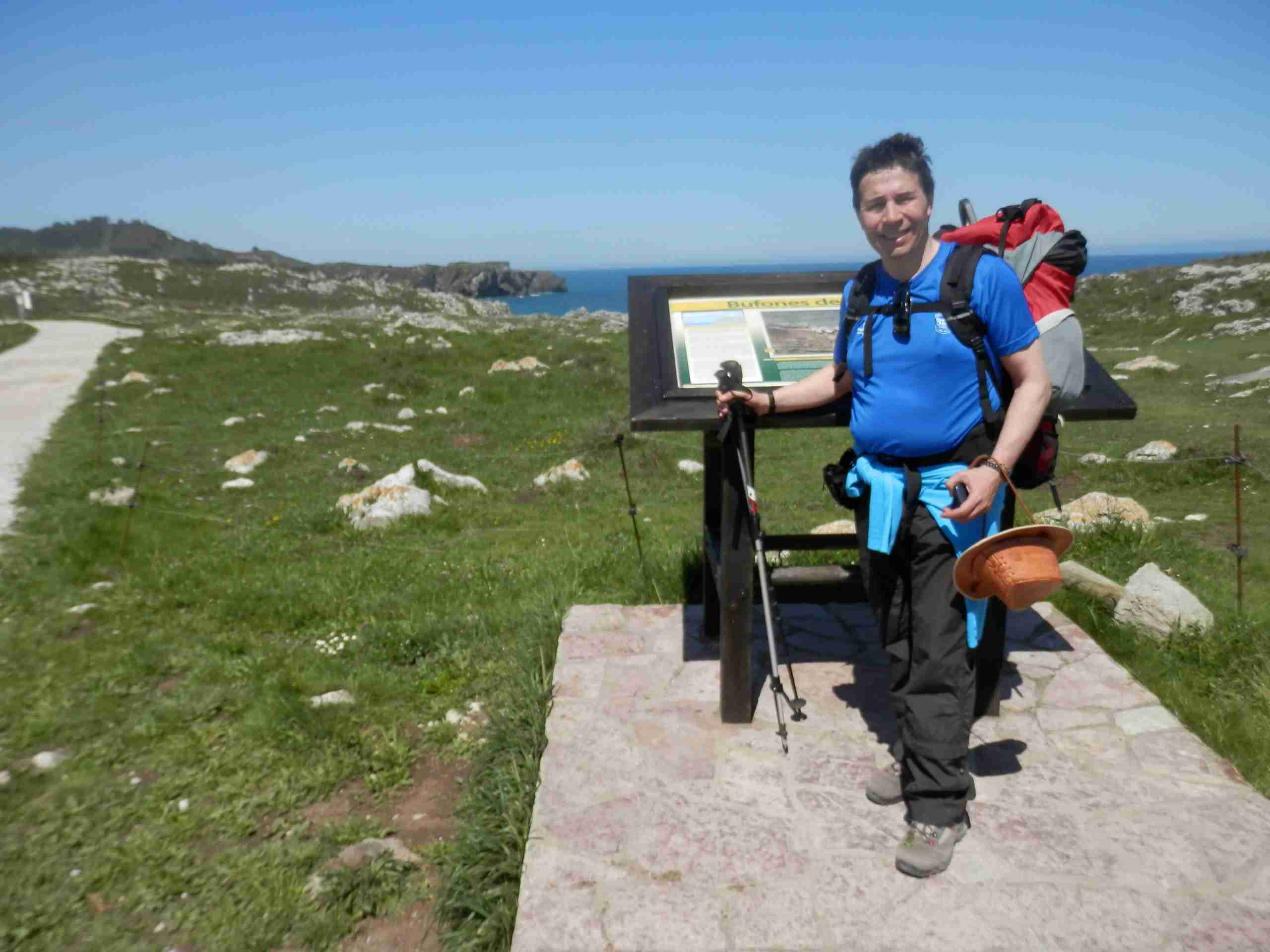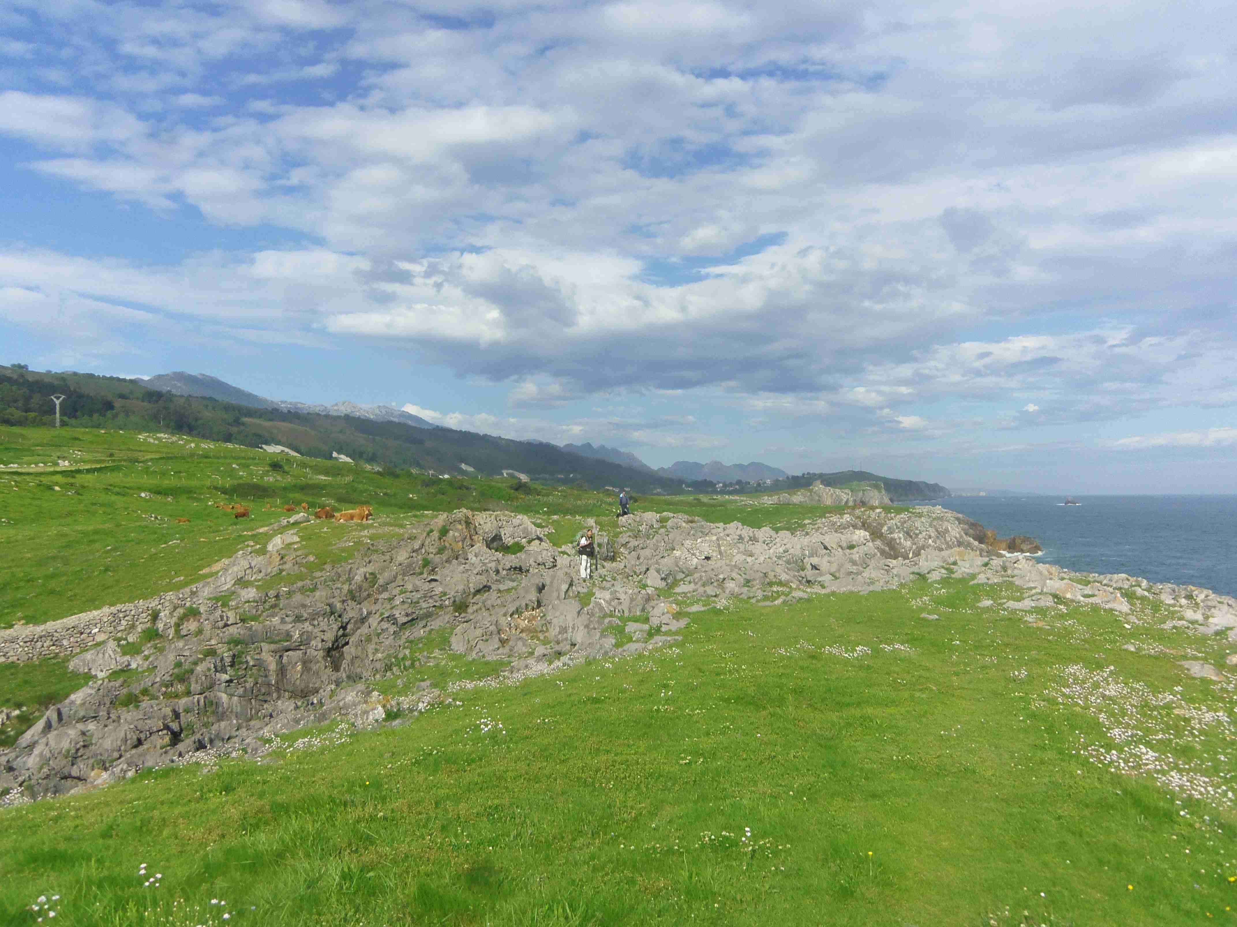 Caminamos bajo la fina lluvia dejando atrás Buelna con impresionantes vistas del mar. Seguimos la senda costera con intención de acercarnos a los famosos bufones. En la senda montañosa encontramos una señal que indica un desvío hacia la costa que nos obliga a cruzar la carretera y saltar una cerca de alambre de espino. La senda cerca del acantilado es bastante incómoda y, aunque vemos algún bufón, no están activados pues el mar está en calma. Caminando como podemos por una senda de cabras llegamos hasta Pendueles, al Bar Castiellu, donde Luís nos había dicho que nos esperaba. Cuando llegamos, Luís ya no estaba. De todas formas nos tomamos allí un pequeño tente en pie.