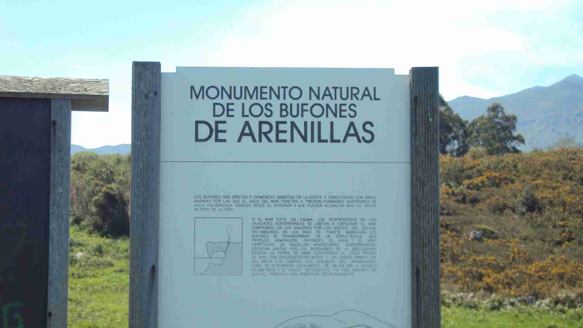 Después de unos cuatro kilómetros, un cartel nos indica que estamos ante los famosos Bufones de Arenillas. Se trata de grietas o chimeneas abiertas en la costa, y conectadas con simas marinas, por las que el agua salada penetra a presión, formando surtidores de agua pulverizada que pueden alcanzar más de 20 metros de altura.