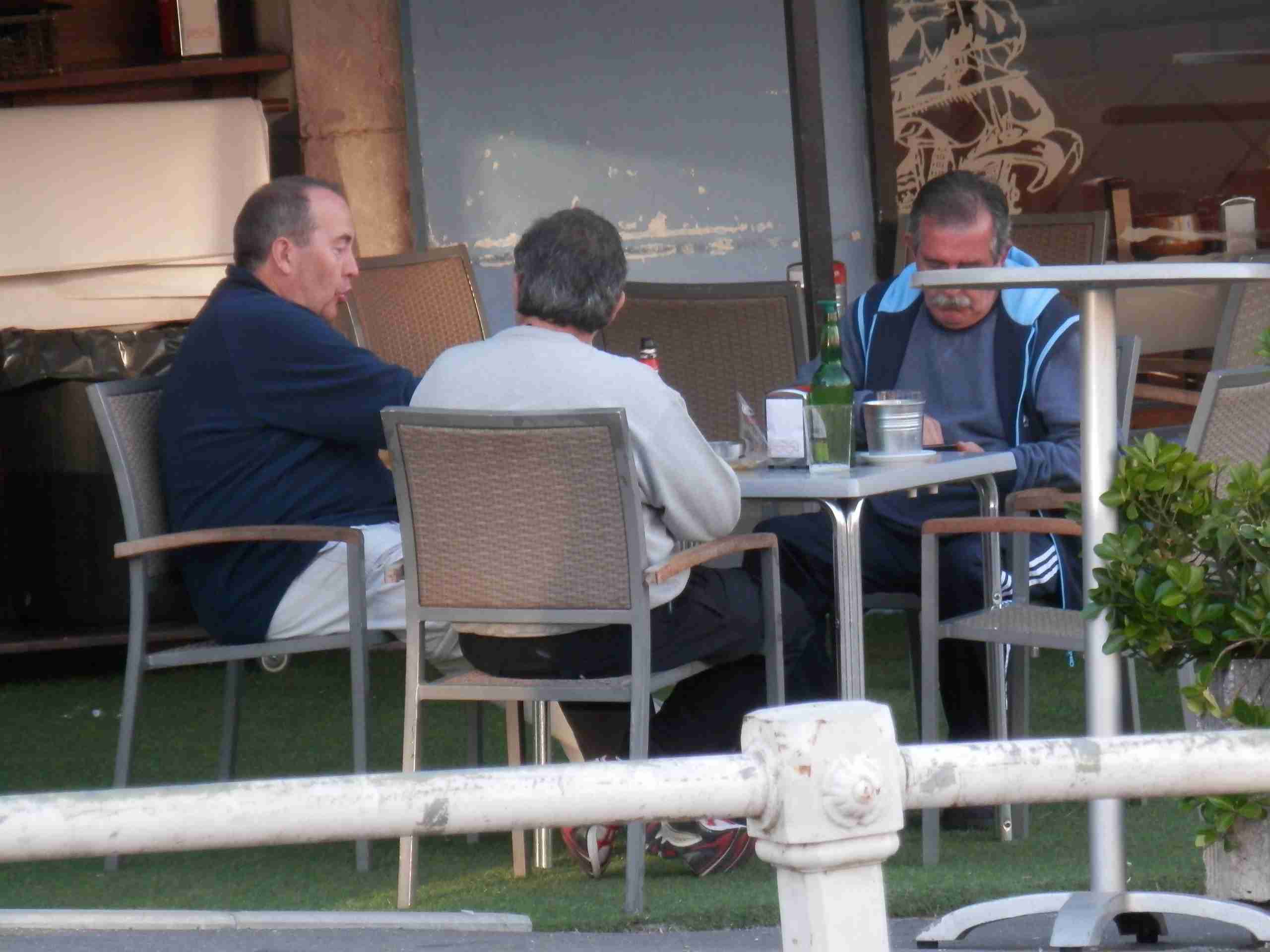 Después de darnos una vuelta por la población decidimos sentarnos en una terraza a tomar unas sidras. Pronto se nos unen Luís y Primi. A Primi, sin tiempo a sentarse, le aconsejamos se de una vuelta por "los cubos de la memoria", pues él no los ha visto.