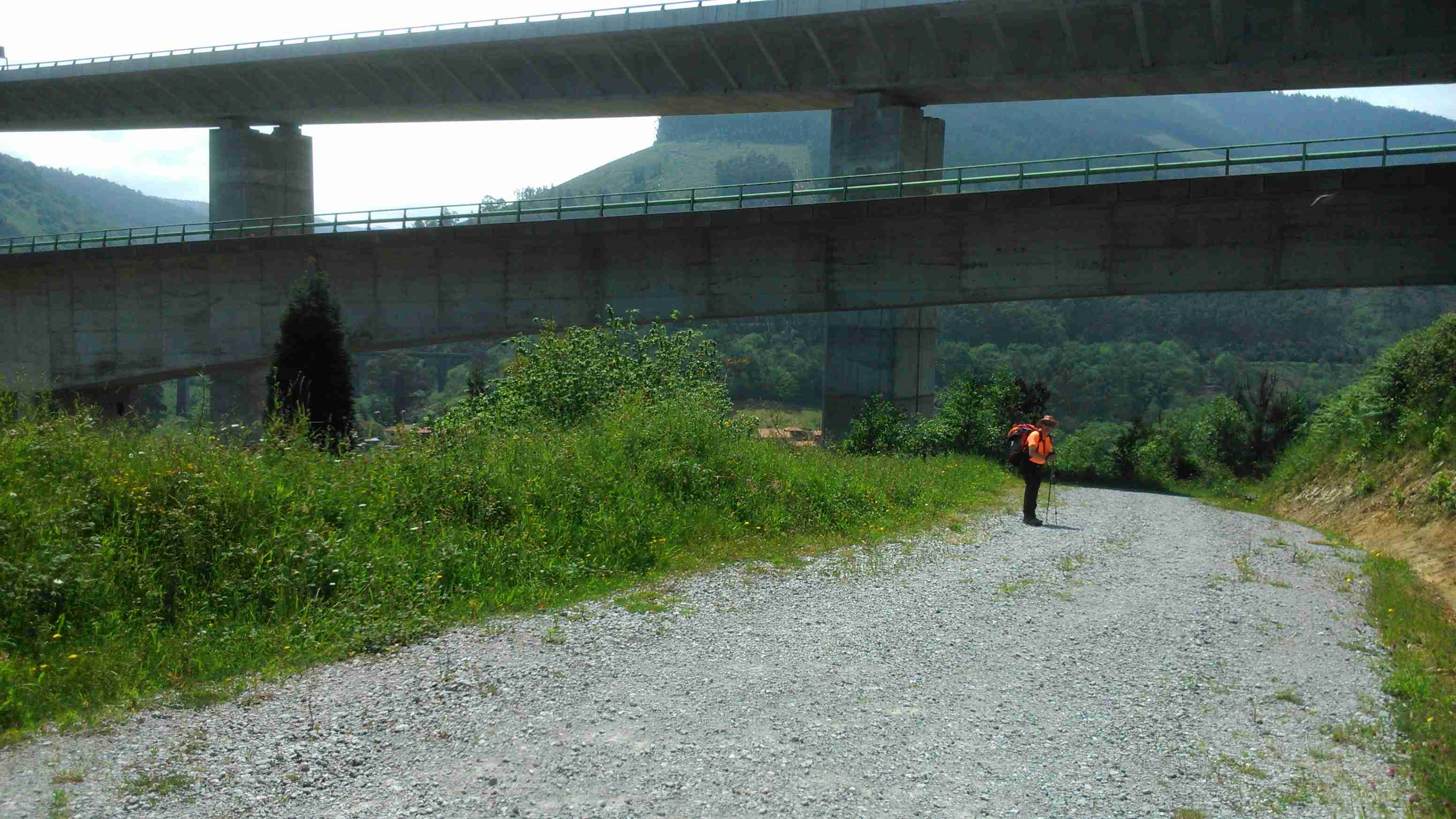 Mientras descansamos al sol, llega Paco, que viene desde Cudillero, y que apenas se detiene a saludarnos continuando el camino. Poco tiempo después salimos tras él bajo las impresionantes moles de granito del viaducto de la autopista.