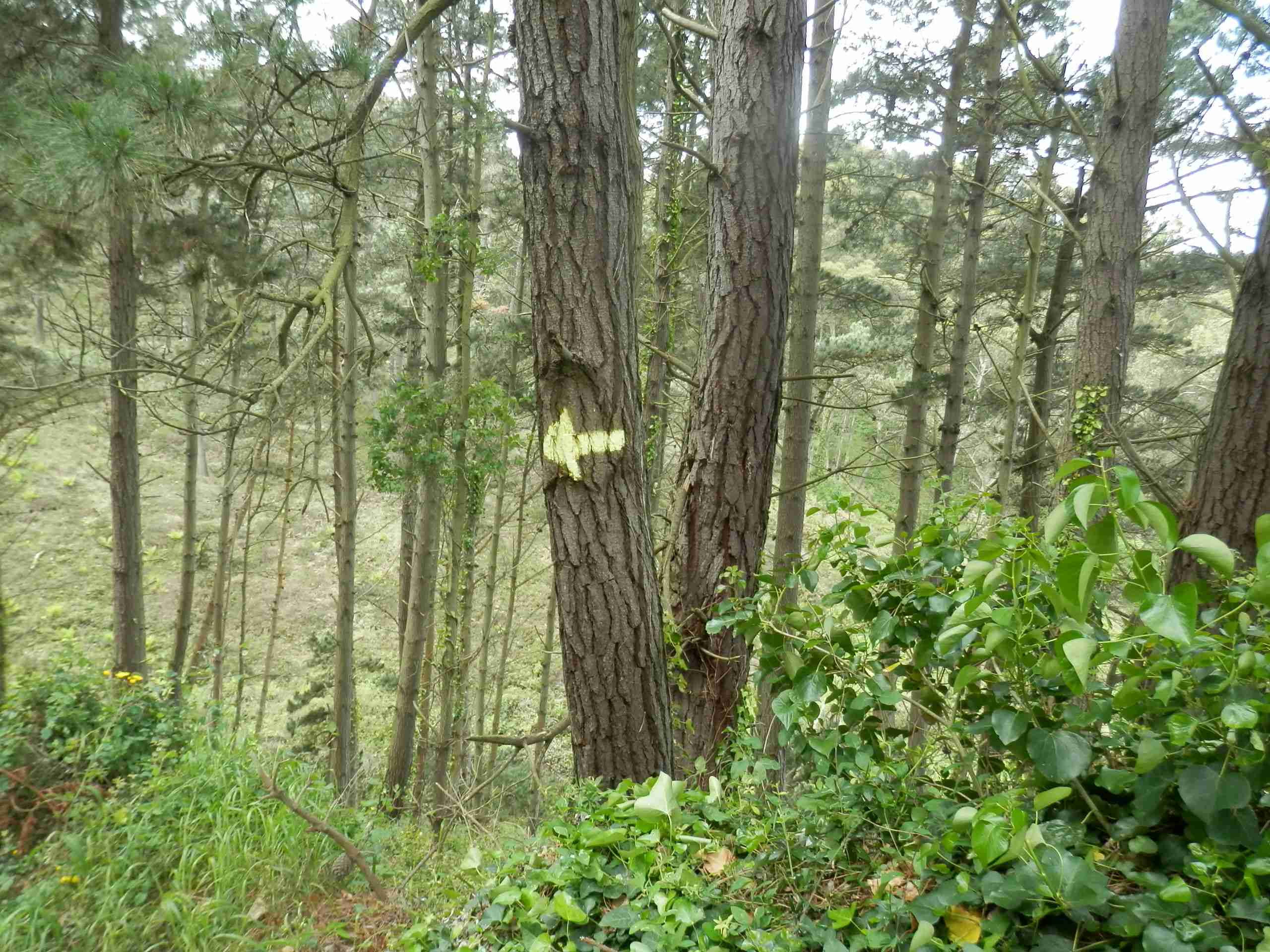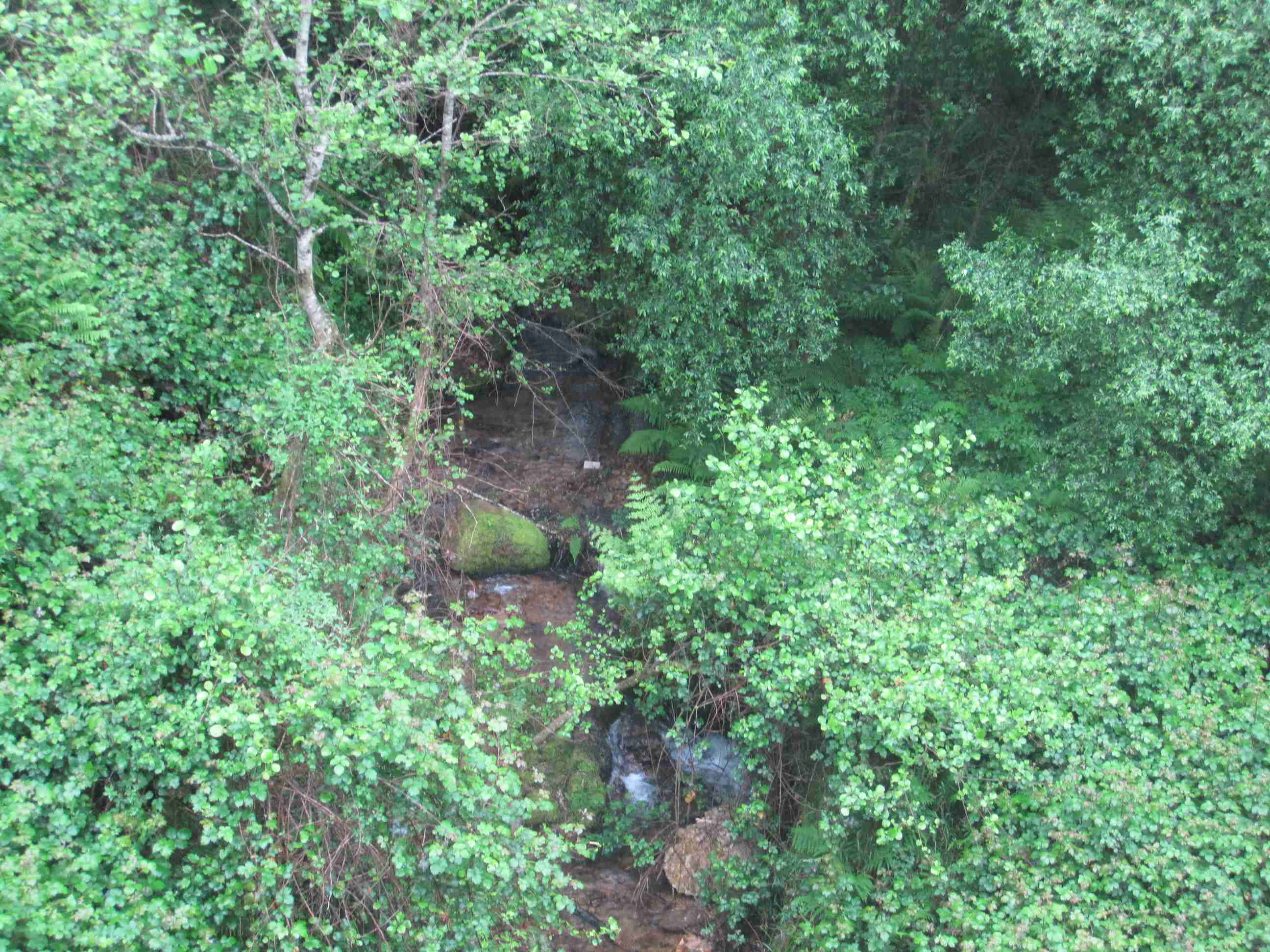 Le vereda se abre paso por el monte a través de la espesa vegetación, hasta que cruzamos un pequeño arroyo y comenzamos la fuerte ascensión que nos conduce hasta la carretera ya cerca de Santa Marina. Me resguardo unos minutos de la lluvia en una de las paradas de autobús, y se me acerca Theodor que comenta que se ha mojado las botas al atravesar el riachuelo. Le digo que, muy cerca del paso del riachuelo, había unas rocas para poder cruzarlo sin mojarse. No sé si me ha entendido algo o no.