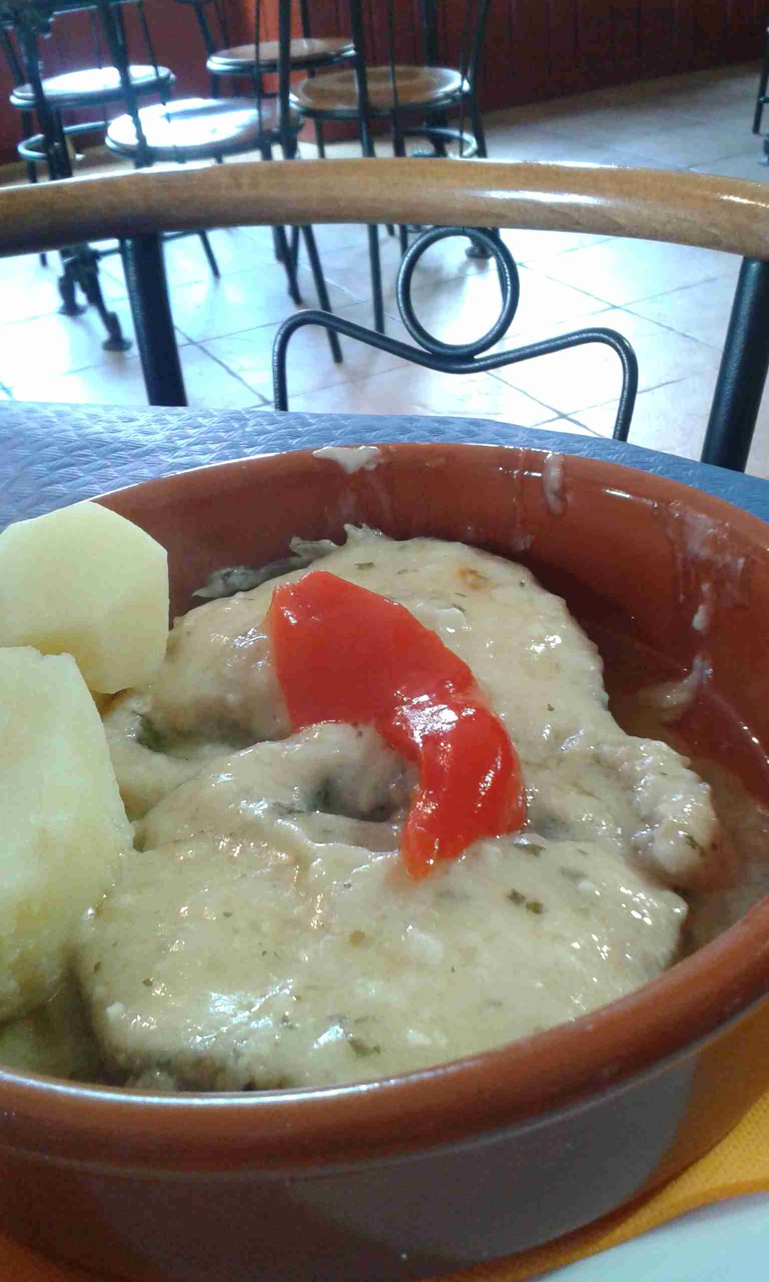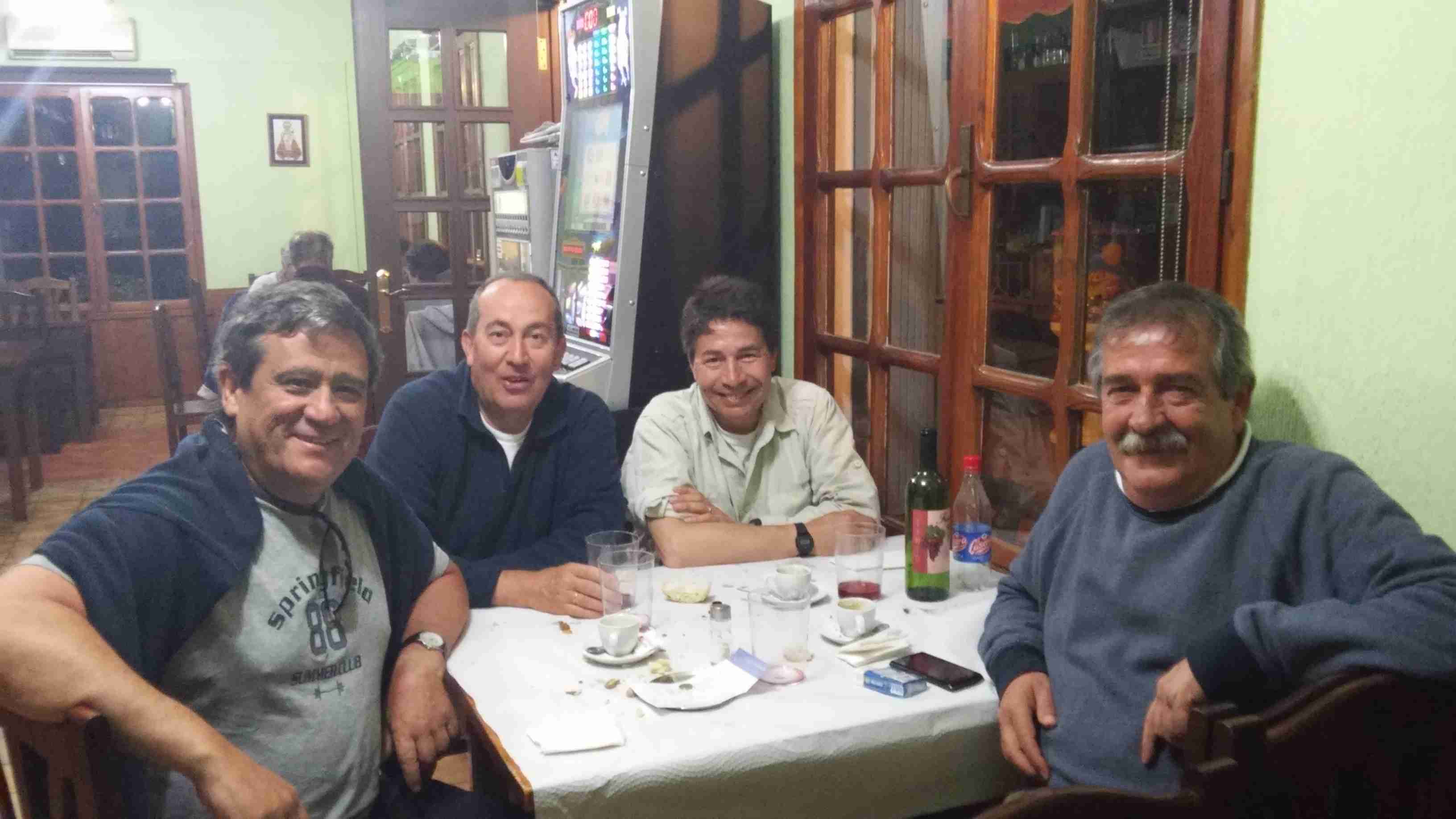Pronto llega Ángel al restaurante pues venía tras de mí, y luego Primi y Paco. Comemos en la terraza donde hemos preparado un tenderete con nuestras camisetas al sol. La comida no estaba muy allá, aunque nos tomamos una buena fuente de garbanzos con callos que, aunque parecía muchísimo, Paco y Primi dieron buena cuenta de ella. Ángel y yo comimos una exquisita merluza a la cazuela.