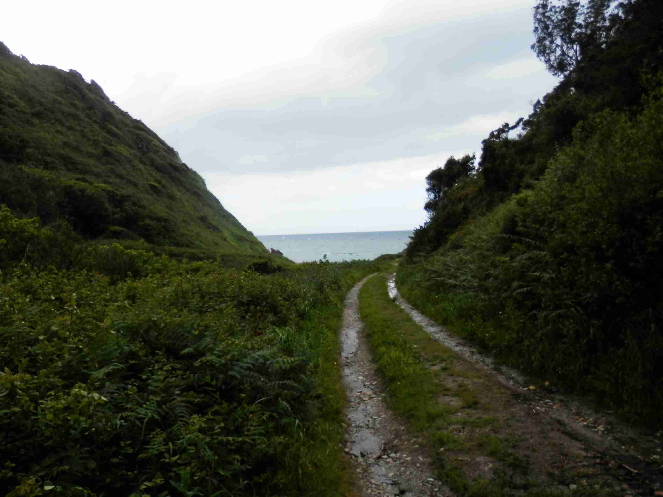 En un leve receso de la lluvia salgo hacia Castañeras bajo el paraguas con intención de acercarme a su Playa del Silencio. La senda se estrecha en un descenso embarrado y deslizante que dificulta el caminar.