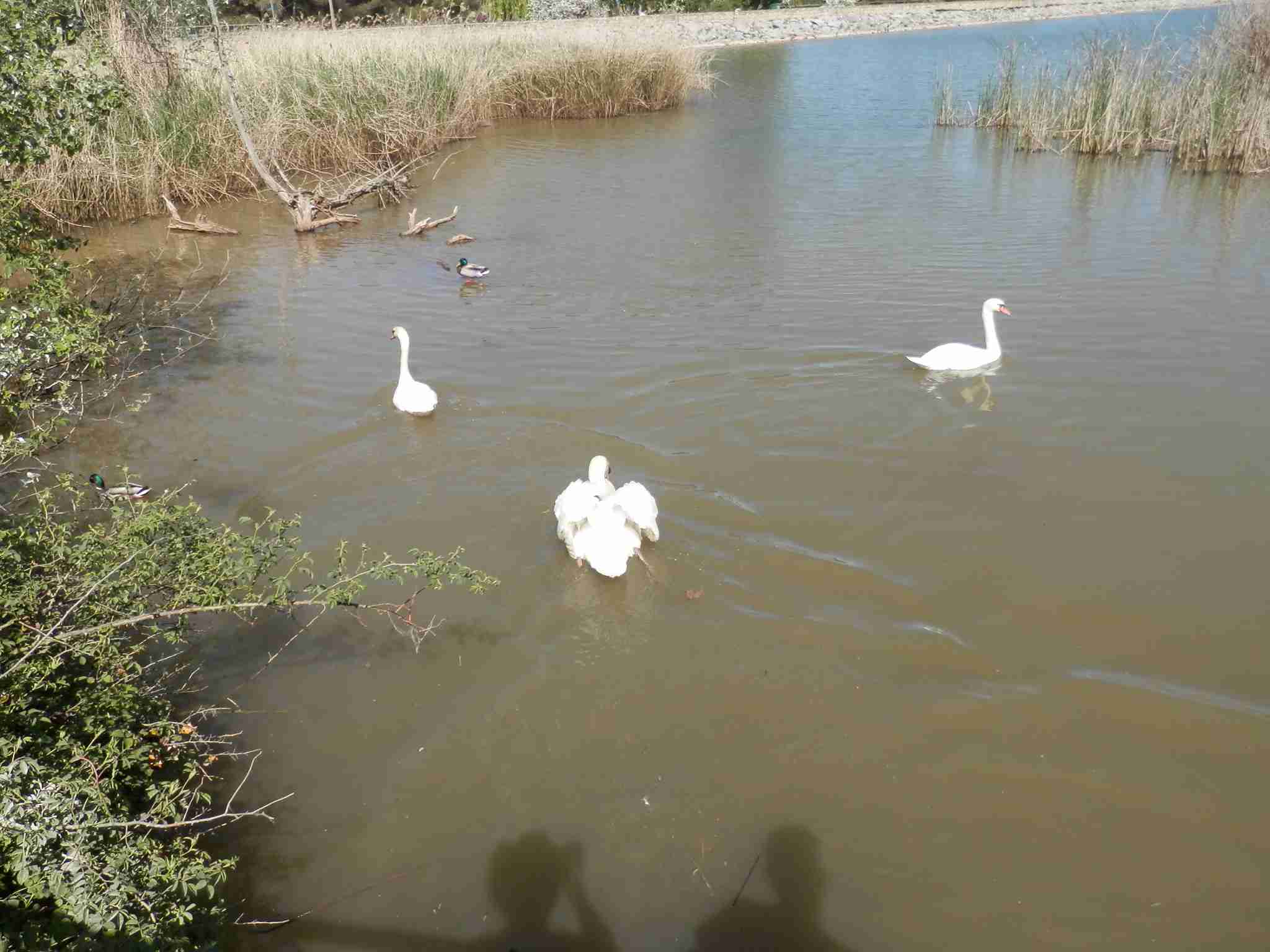 Bajo un fuerte sol, cruzamos despacio el parque de la Grajera y la Barranca. Hay mucha gente tomando el sol alrededor del lago. Se ven algunos patos, ocas y cisnes en el agua. También se ven algunos pescadores.
