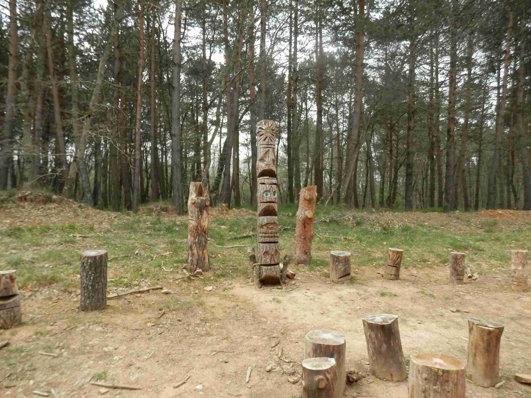 Continuamos subiendo hasta el Alto de la Pedraja (1.157 m). Pasamos un claro en el camino con figuras talladas de madera y algunos totems al estilo índio y, tras una suave bajada y una fuerte lluvia, llegamos a San Juan de Ortega. El albergue está completo por lo que muchos peregrinos tienen que continuar. Nosotros tenemos pensado llegar hasta Agés. Paramos a sellar y tomamos unas cervezas con pinchos, sentados en la ventana de la cafetería, mientras observamos la lluvia.