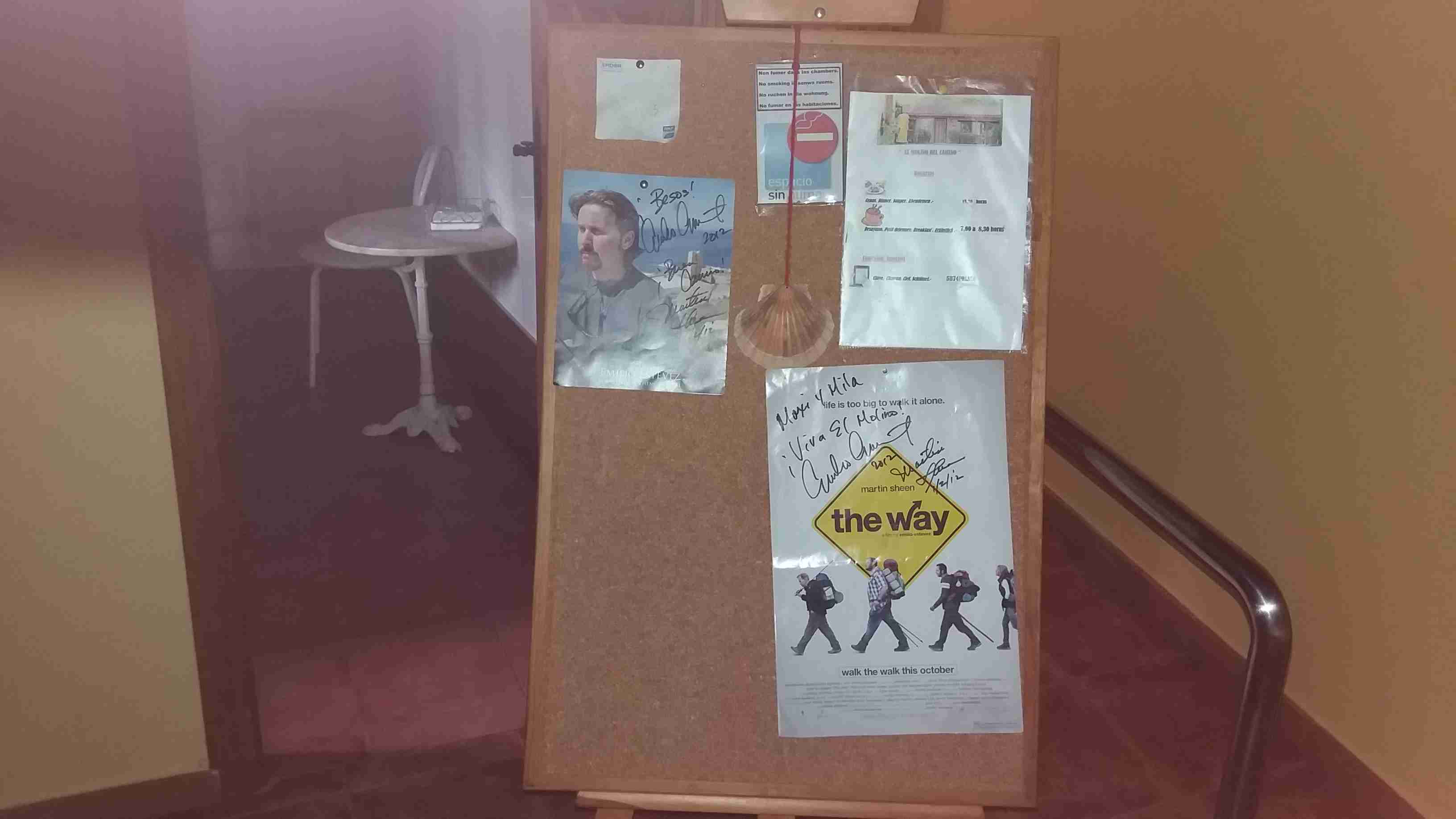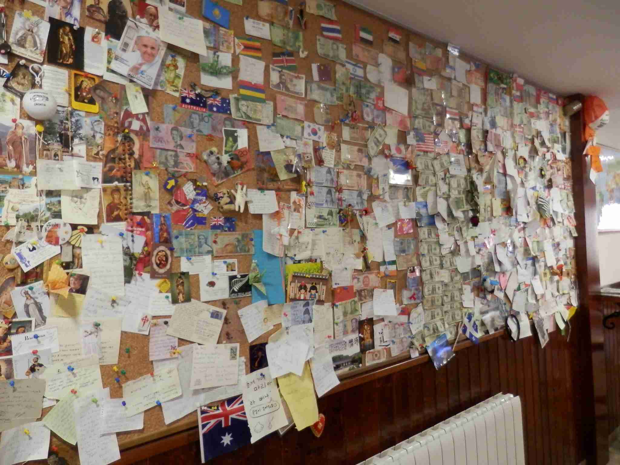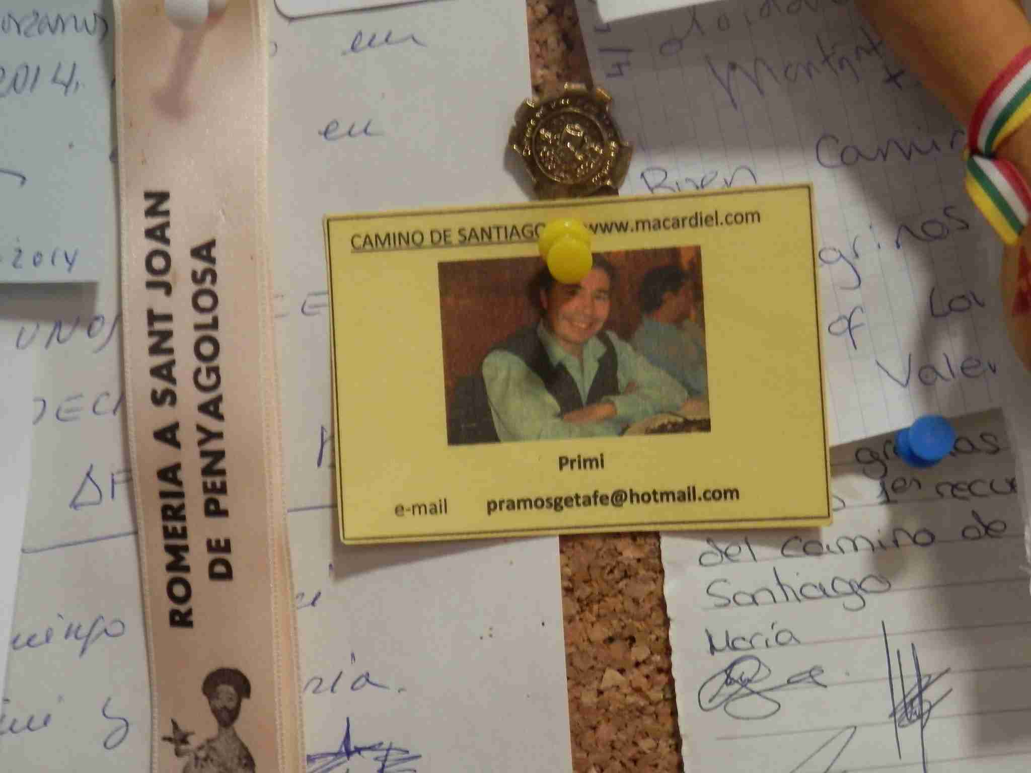 El dueño del albergue, que llevaba apenas dos meses abierto y que obsequiaba a sus clientes con una medalla de la virgen, le enseña a Primi las habitaciones además de un mural de corcho con infinidad de mensajes de peregrinos. Primi aprovecha para dejar nuestra tarjeta junto a las otras.