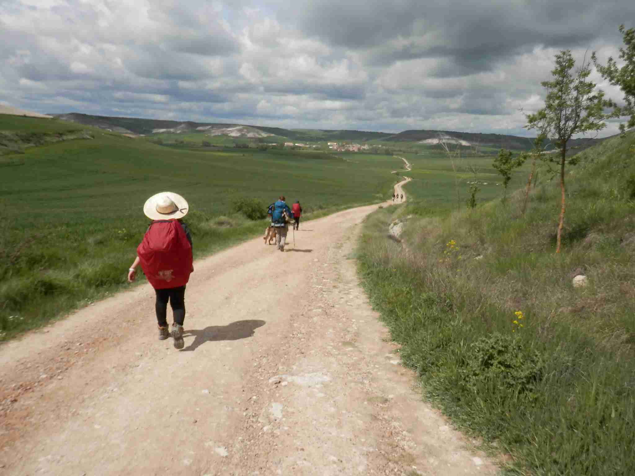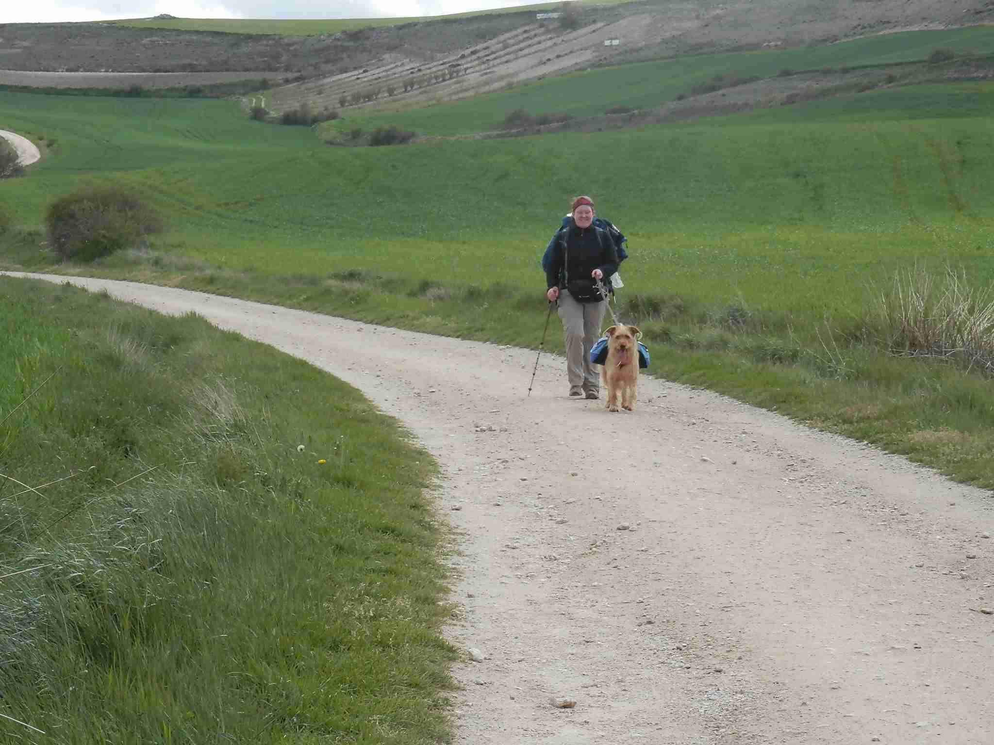 Continuamos el camino, entre campos de cereales, hacia Hornillos, tras un montón de peregrinos. Vimos, con mucha curiosidad, a una peregrina extranjera con un perro con alforjas. Según nos comentó, dormía en los albergues y, al parecer, no tenía problemas en ellos con el perro. Únicamente, que iban muy despacio.