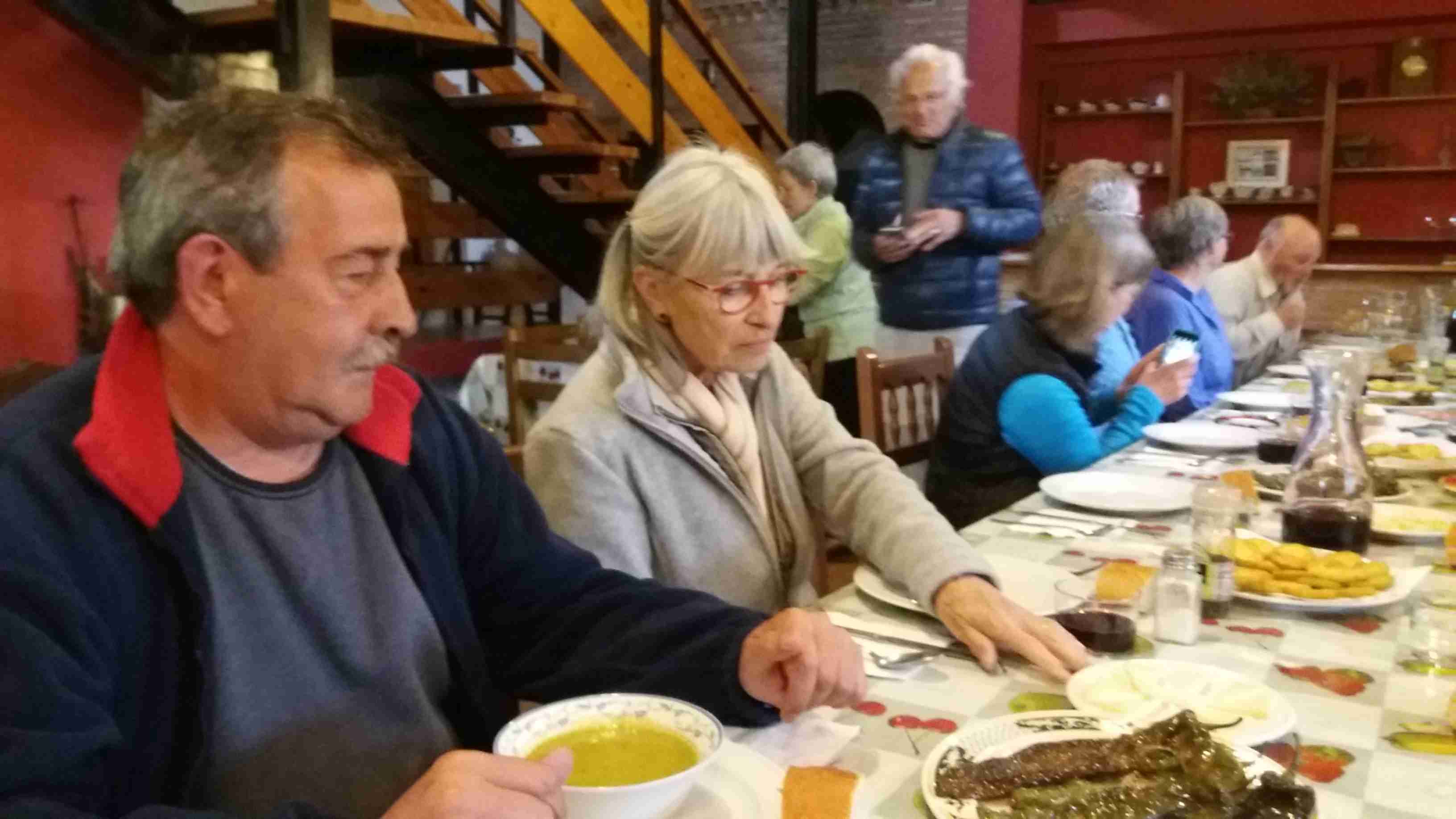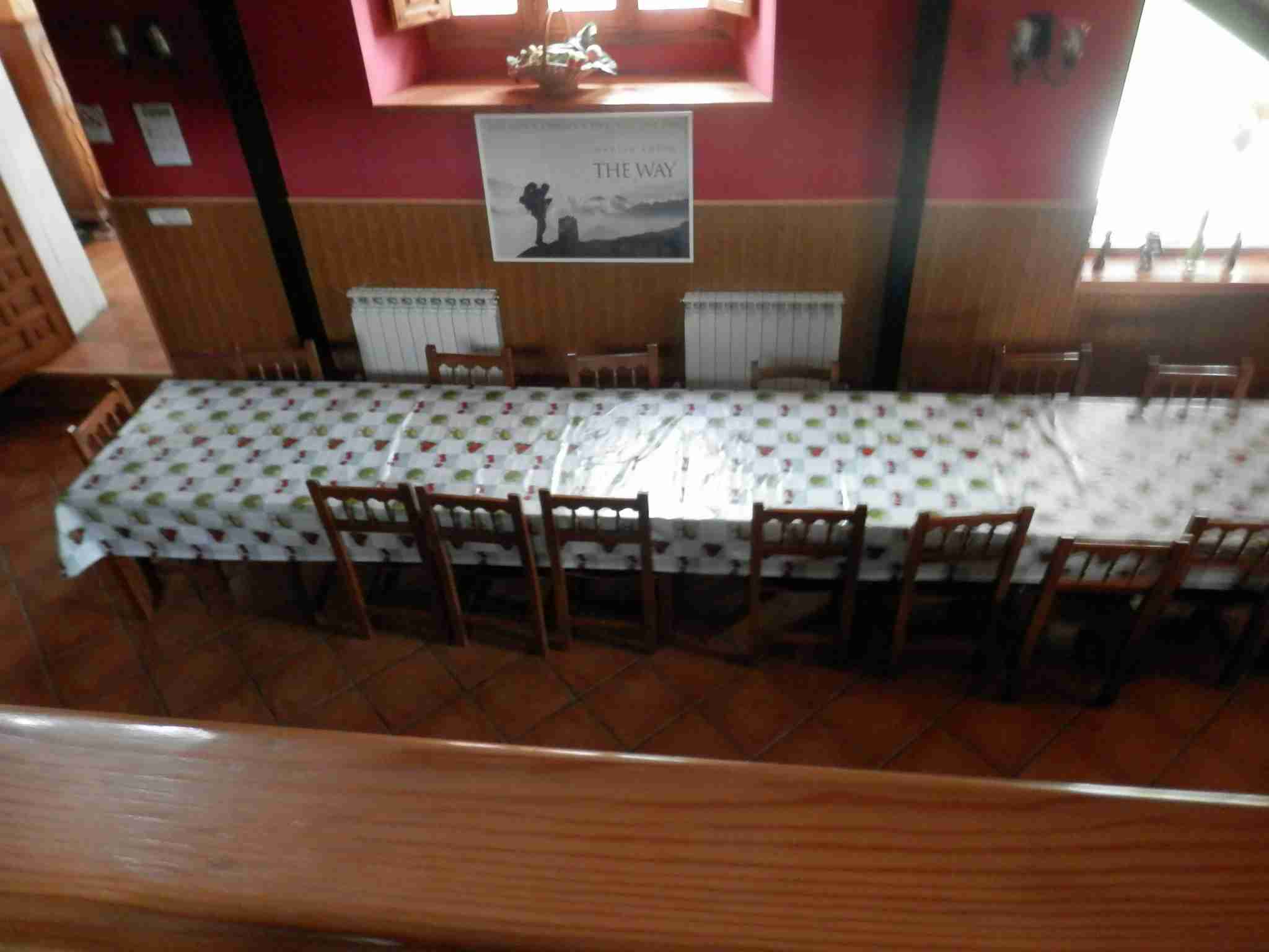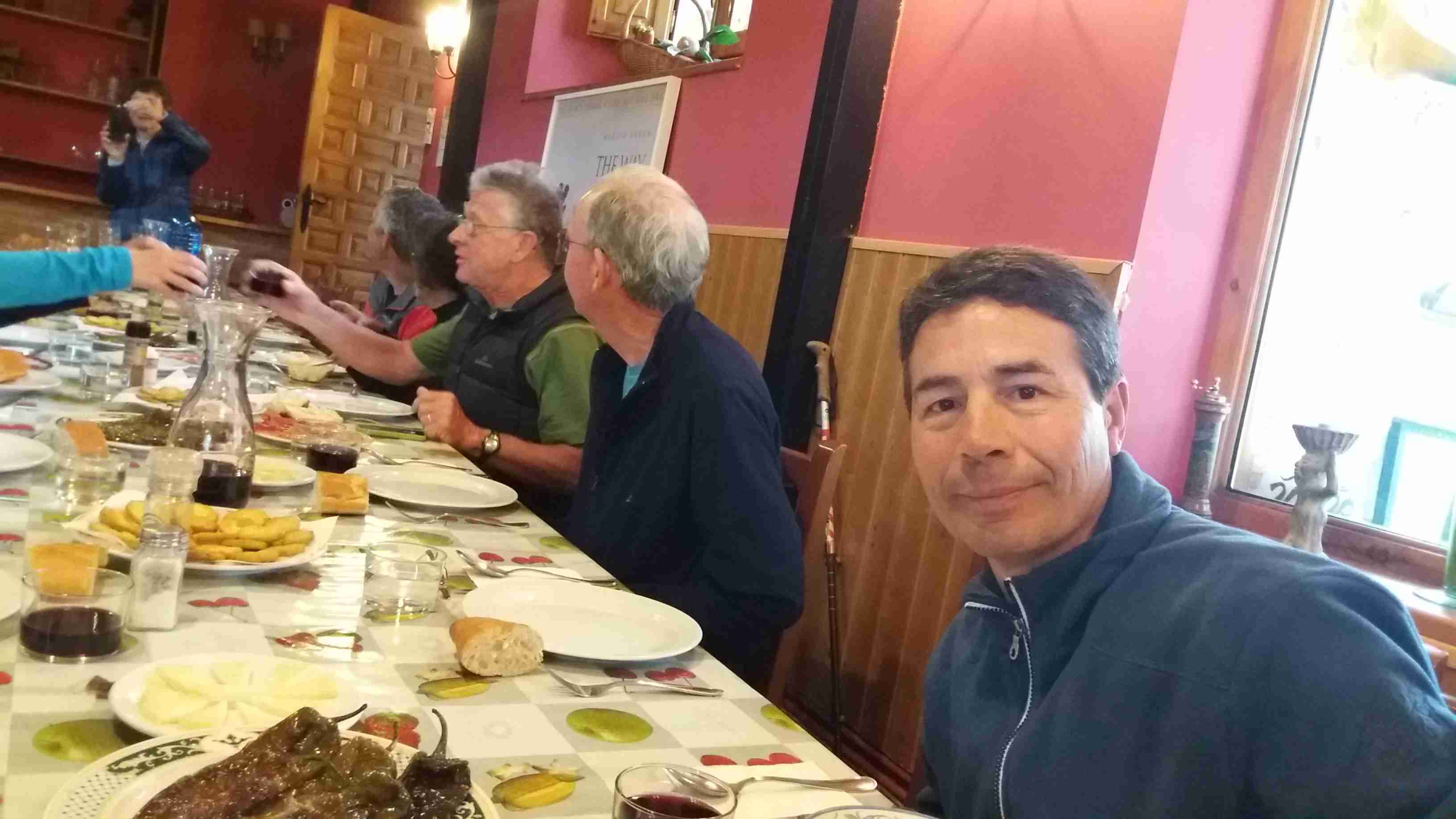 Compartimos la casa con otros peregrinos extranjeros y un pamplonica que llegó lesionado por la noche y que abandonaría el Camino al día siguiente. A las siete de la tarde nos han preparado una cena fantástica compartida con el resto de peregrinos. Sopa de espárragos, entremeses, morcillas de Burgos, bacalao, pimientos asados, calabacín rebozado, buenas ensaladas y otras varias viandas que, acompañadas con un buen vino, han hecho surgir buenas amistades entre el grupo. Hemos comentado anécdotas del Camino en diferentes lenguas y nos hemos conocido todos un poco más.